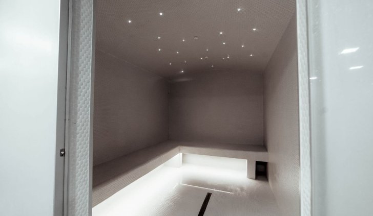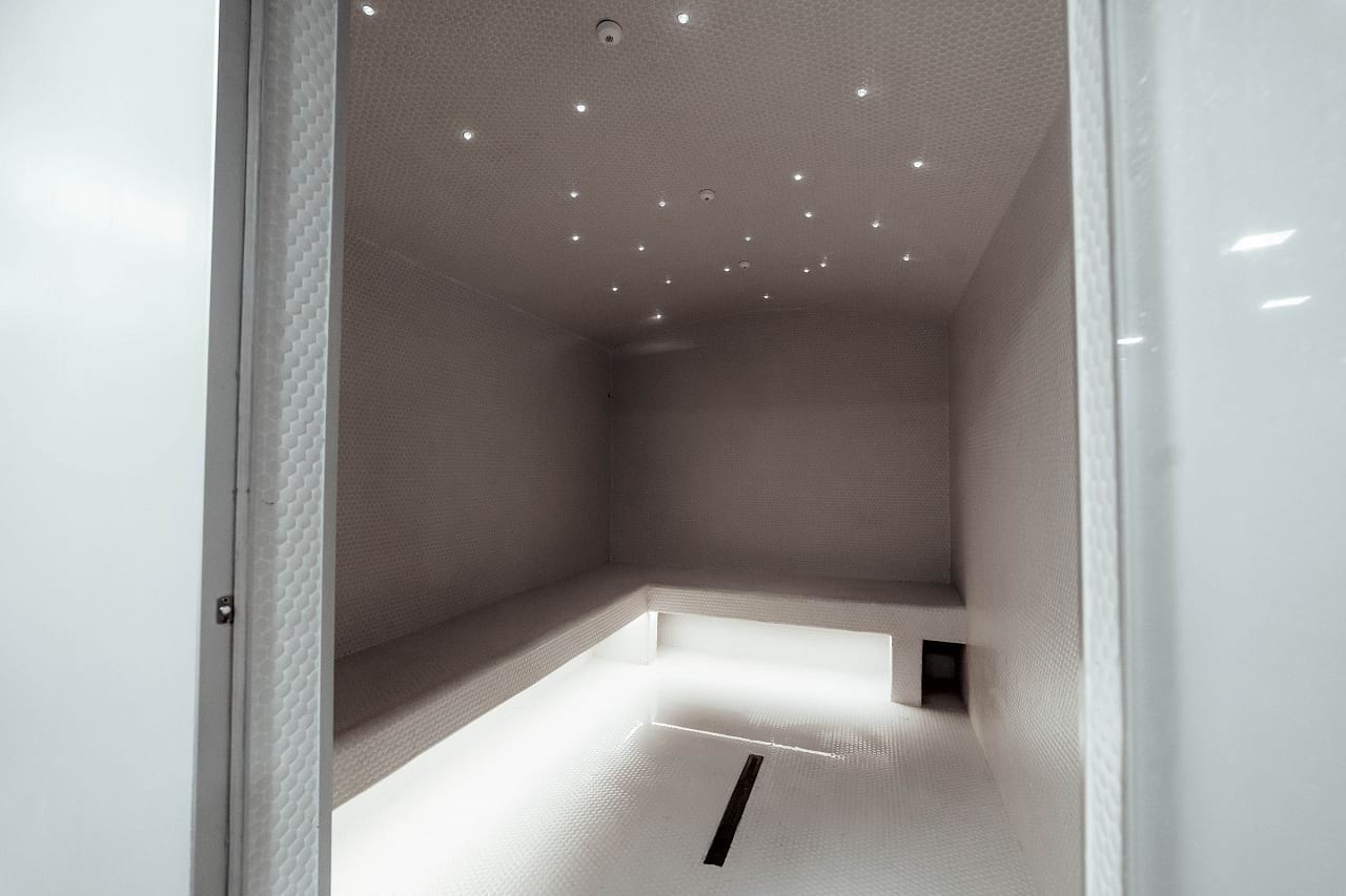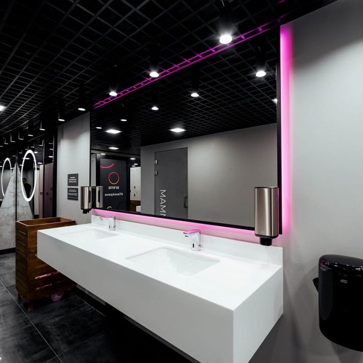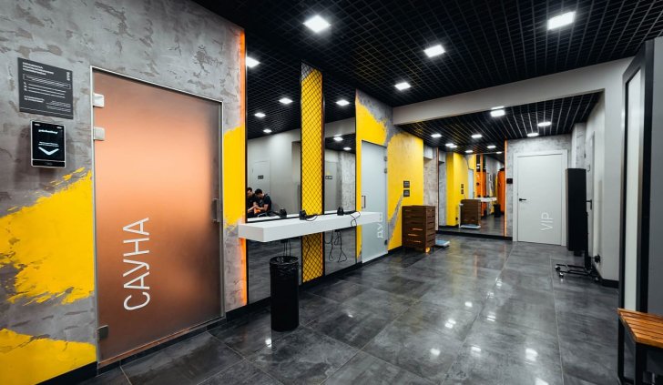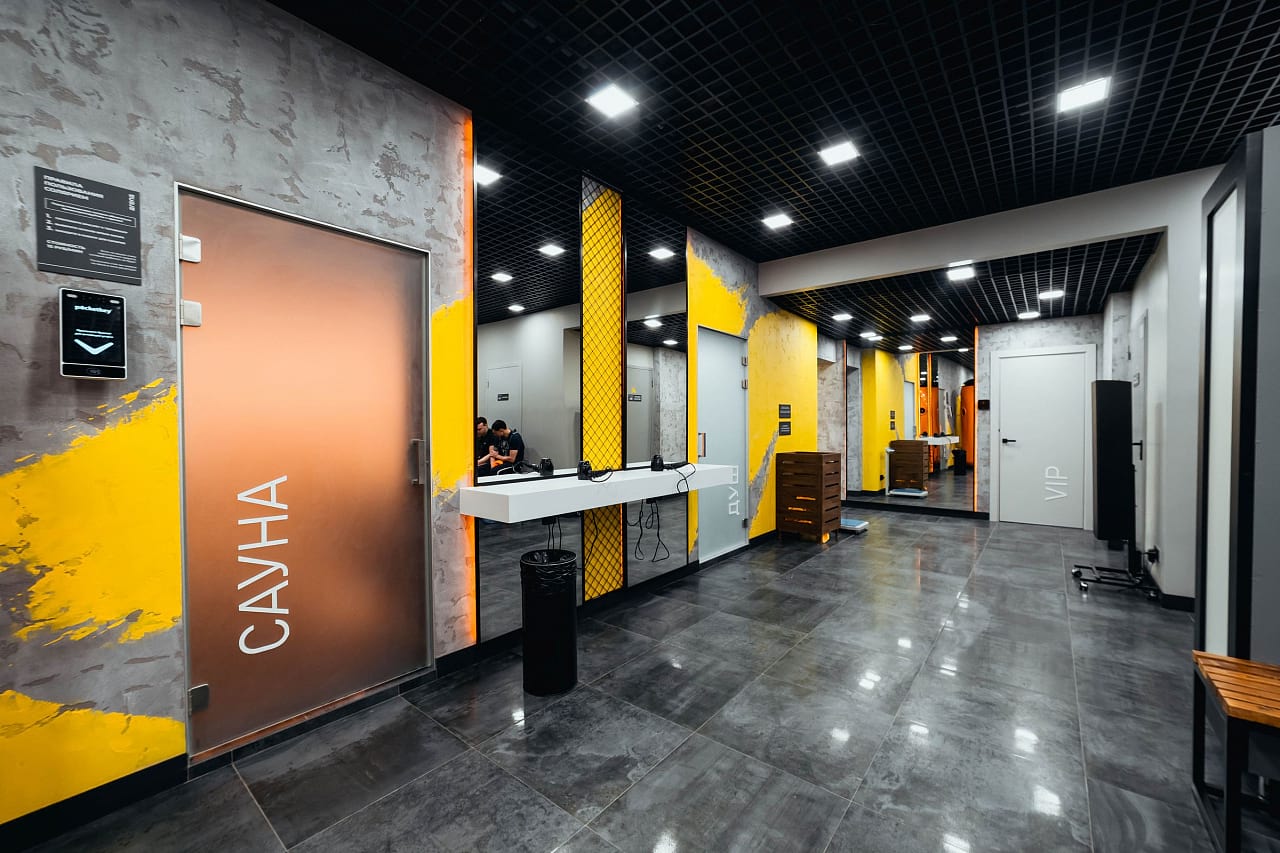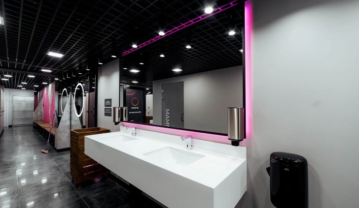 Мягкая светодиодная подсветка создаёт ощущение лёгкости в залах для занятий, входной зоне, а также сауне и хамаме, которые, кроме этого, имеют свои интересные решения, реализованные с помощью светодиодного освещения.