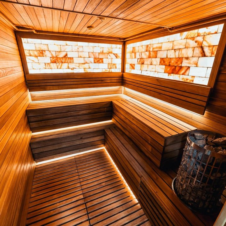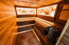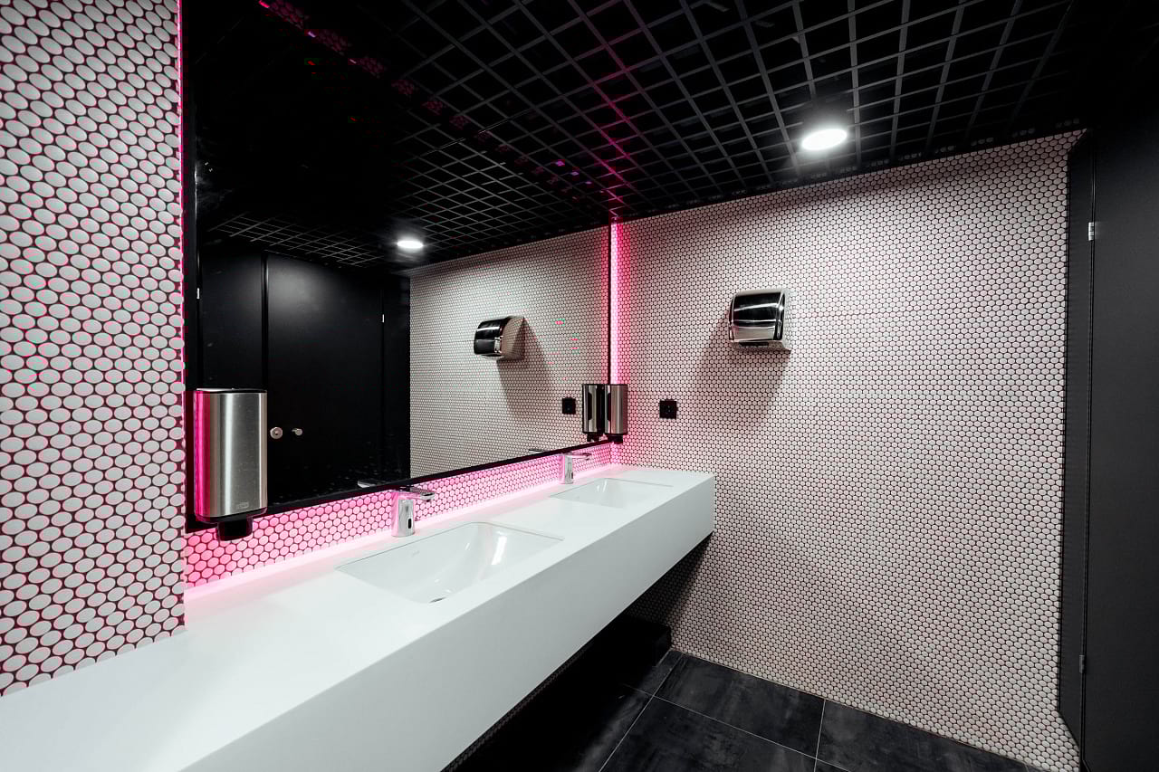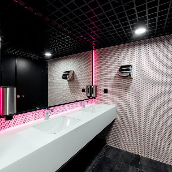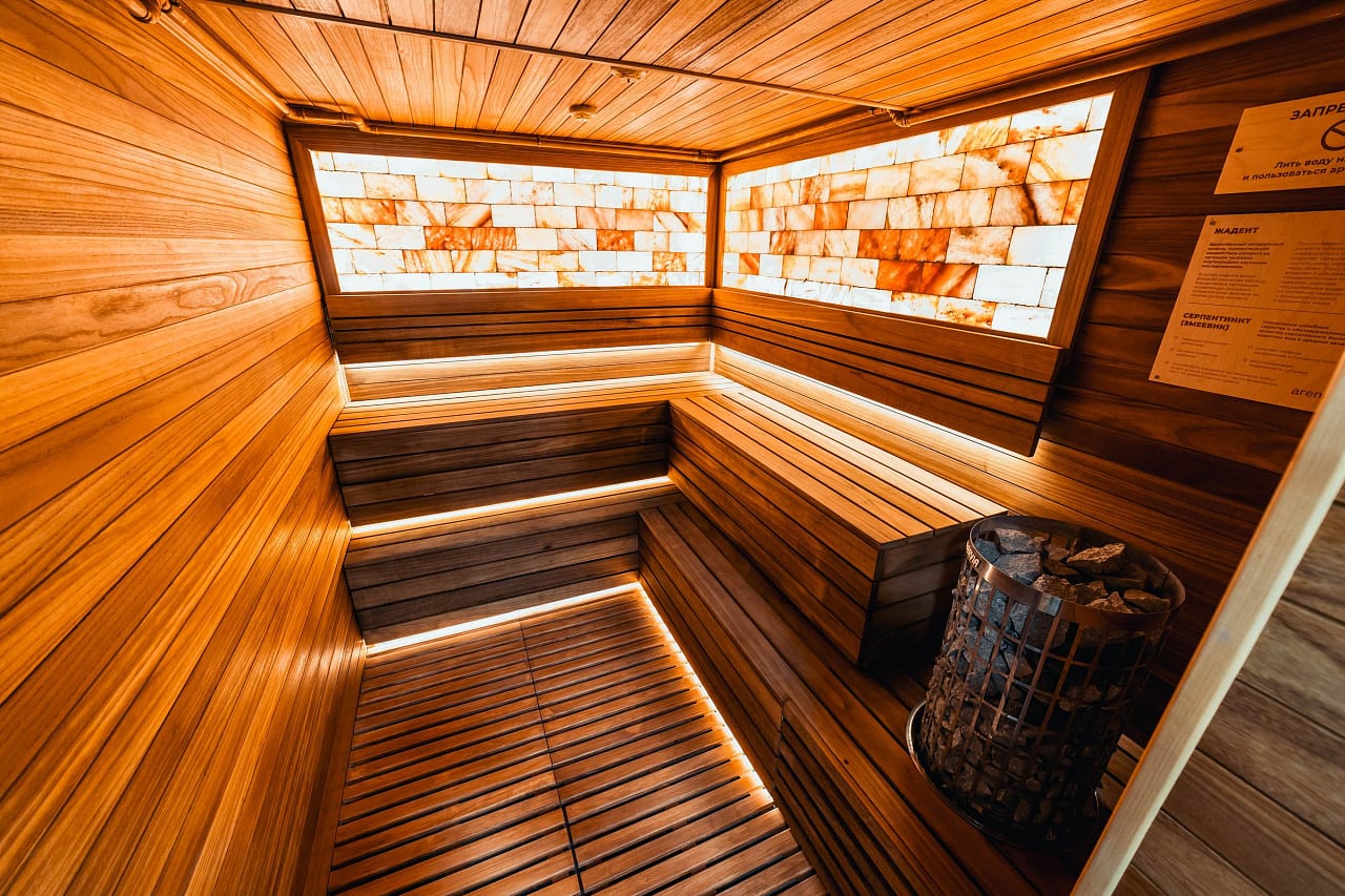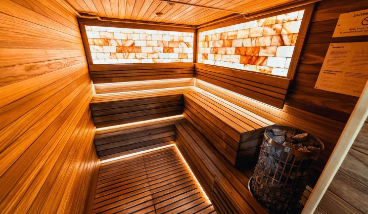 Мягкая светодиодная подсветка создаёт ощущение лёгкости в залах для занятий, входной зоне, а также сауне и хамаме, которые, кроме этого, имеют свои интересные решения, реализованные с помощью светодиодного освещения.