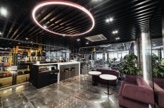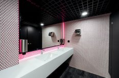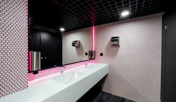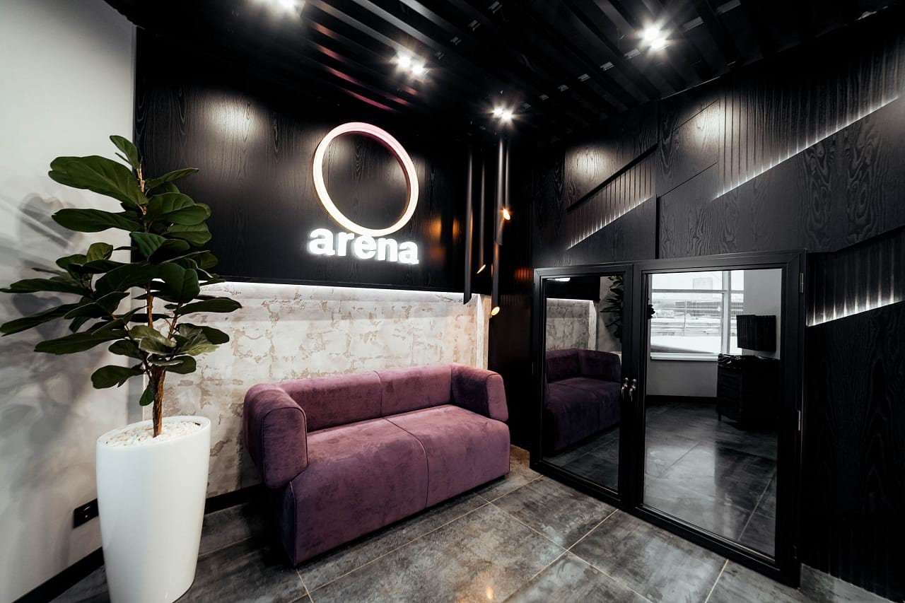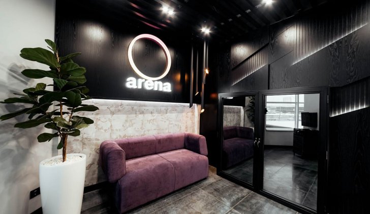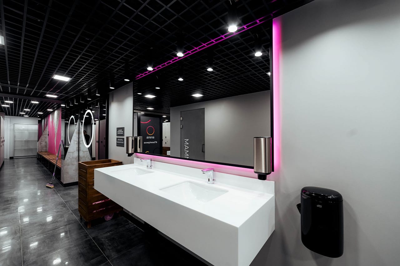 Пространство фитнес-центра Arena в Перми буквально наполнено разнообразными световыми решениями, которые подчёркивают стильный дизайн и статус клуба. Почти монохромный интерьер смотрится выигрышно, благодаря большому количеству фактур и ярких цветовых акцентов, выполненных в том числе и с помощью светодиодной подсветки.
