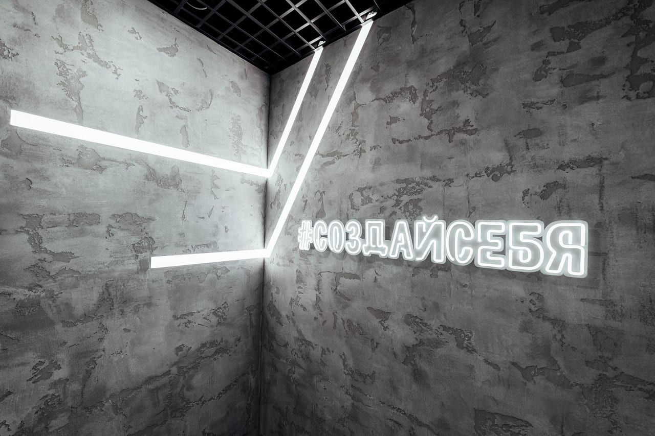 Световые линии подчёркивают зону ресепшна и выступают в декоративной роли и в других помещениях клуба.