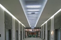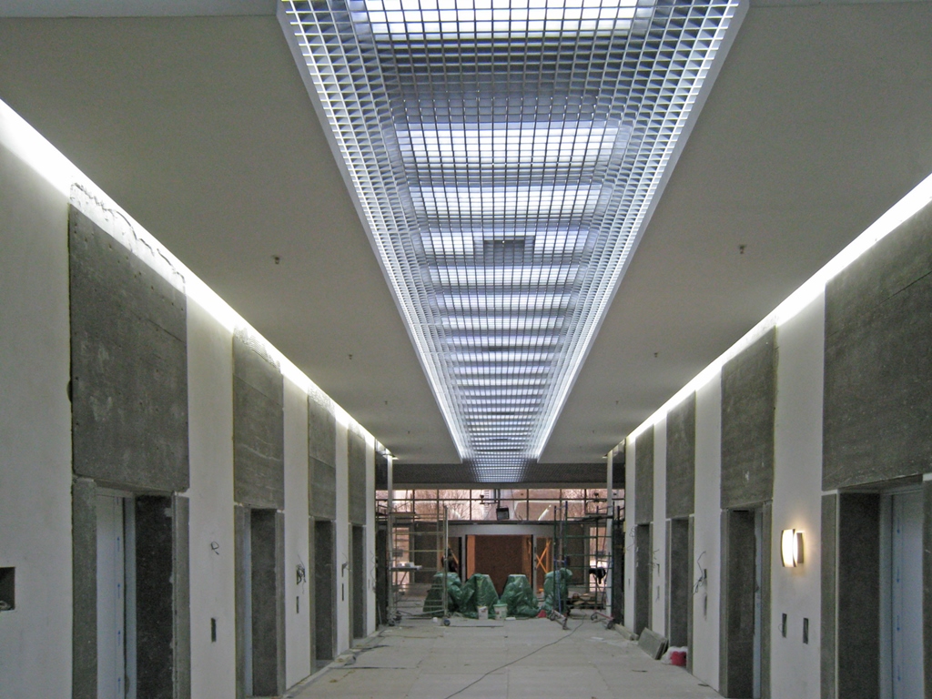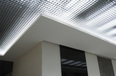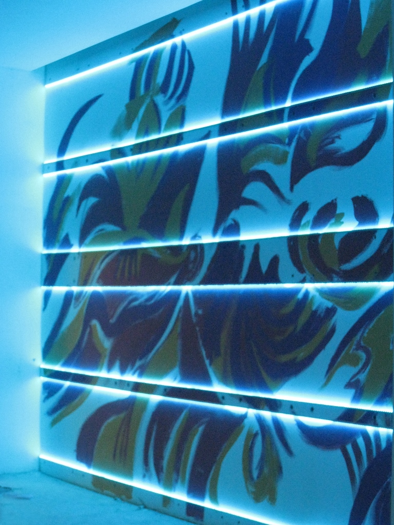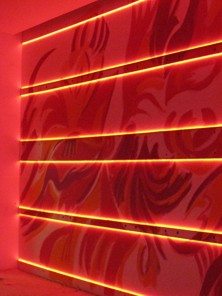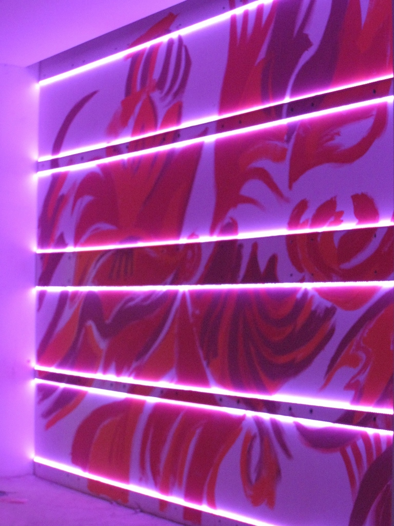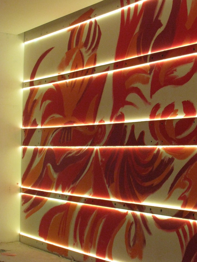Освещение коридора в торговой палате было дополнено светодиодным освещением, расположенным за навесным гипсокартонным многоуровневым потолком. Также была сделана многоцветная подсветка декоративных панелей с применением светодиодной ленты Arlight.