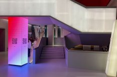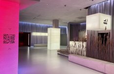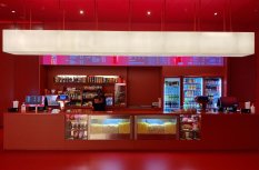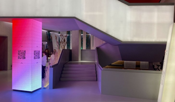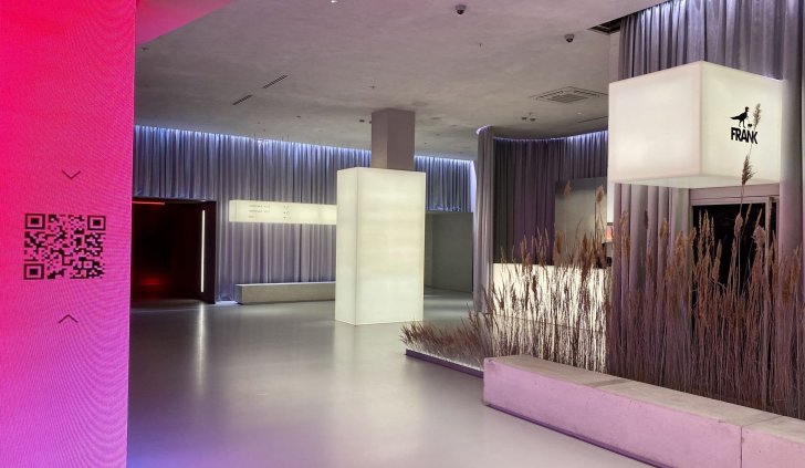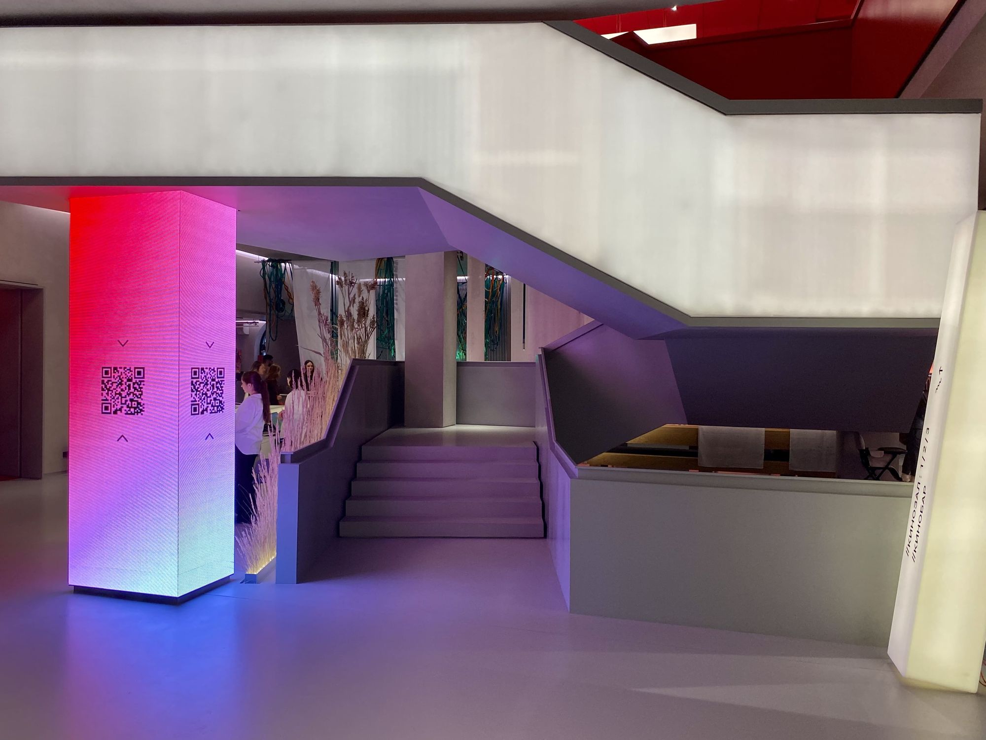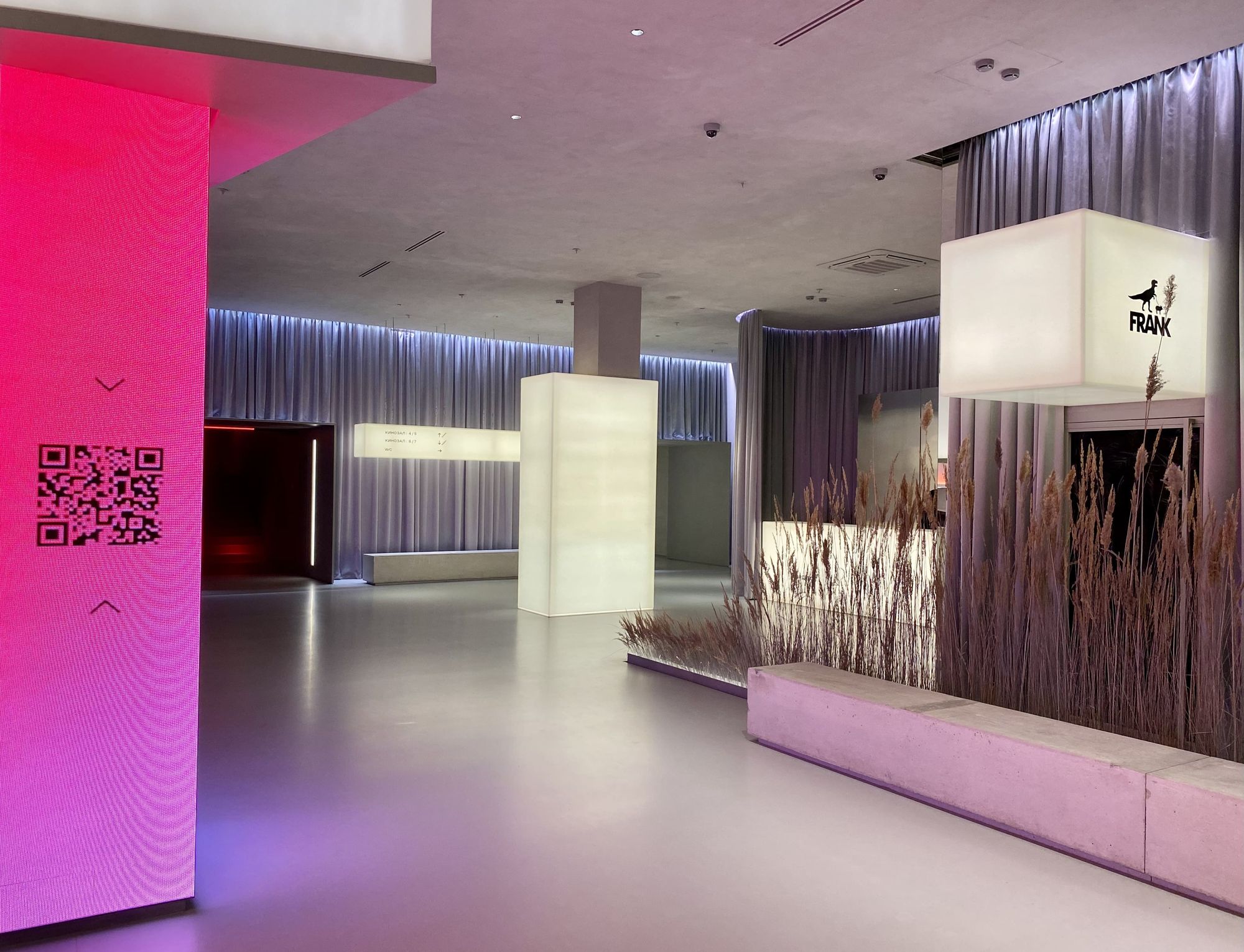 В холле кинотеатра отдельные зоны залиты мягким светом, при этом источник его сложно определить сразу. Стойки касс и гардероба, лестница и декоративные прямоугольные конструкции равномерно подсвечиваются, создавая урбанистический и минималистичный, но в то же время уютный вид благодаря теплому свечению. Подсветка также акцентирует внимание на сухоцветах, приносящих атмосферу уюта в пространство.