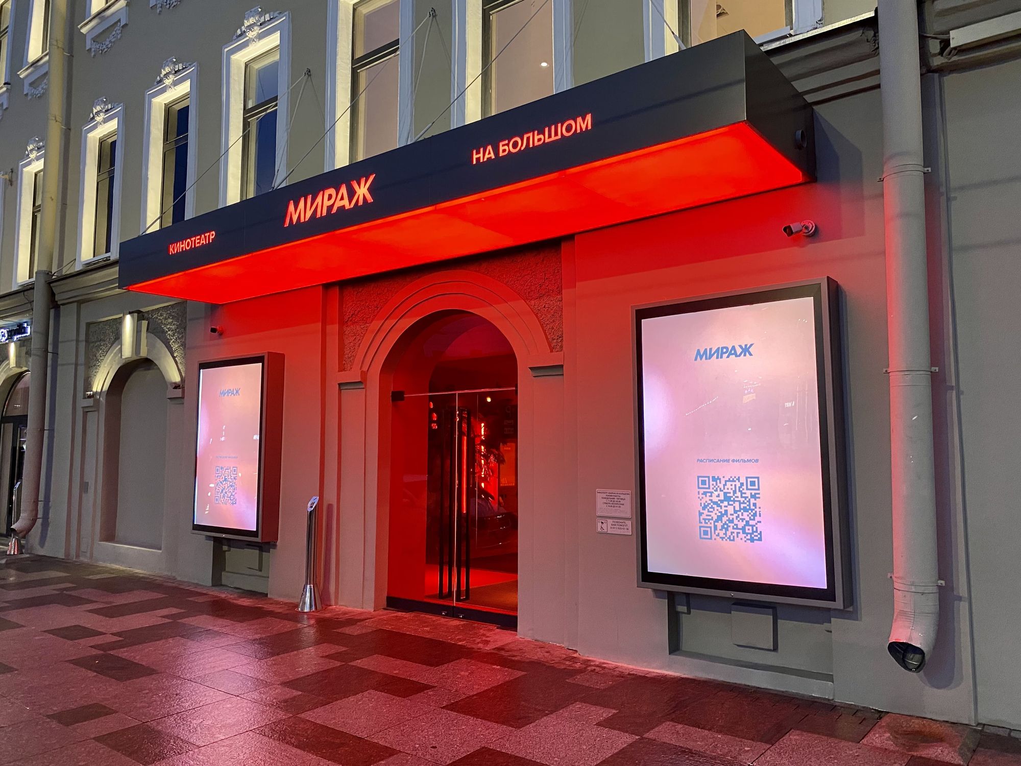 При реконструкции кинотеатра "Мираж Синема" было учтено, что ассоциации с полумраком всегда присутствуют в кинотеатрах, и поэтому освещение должно быть ненавязчивым, но атмосферным. Особую роль в этом играют световые линии, которые успешно решают обе эти задачи.