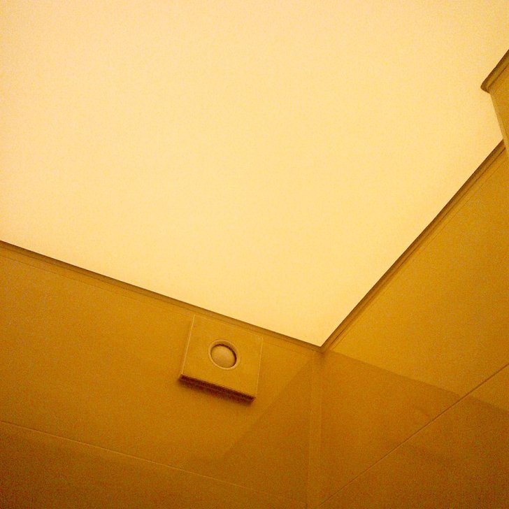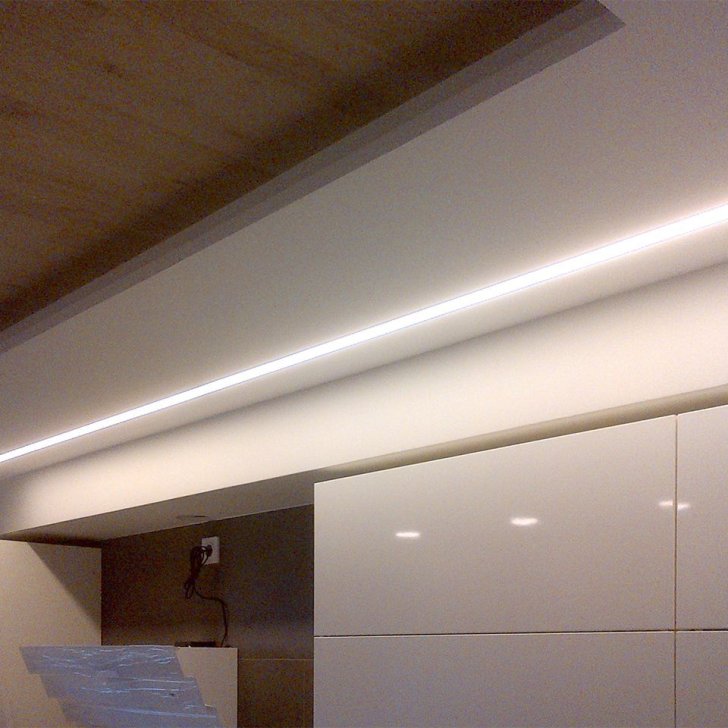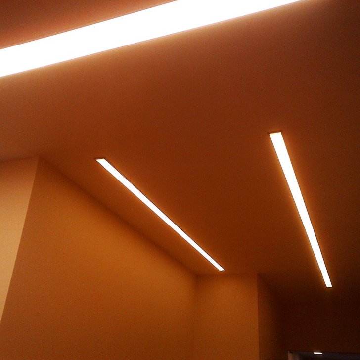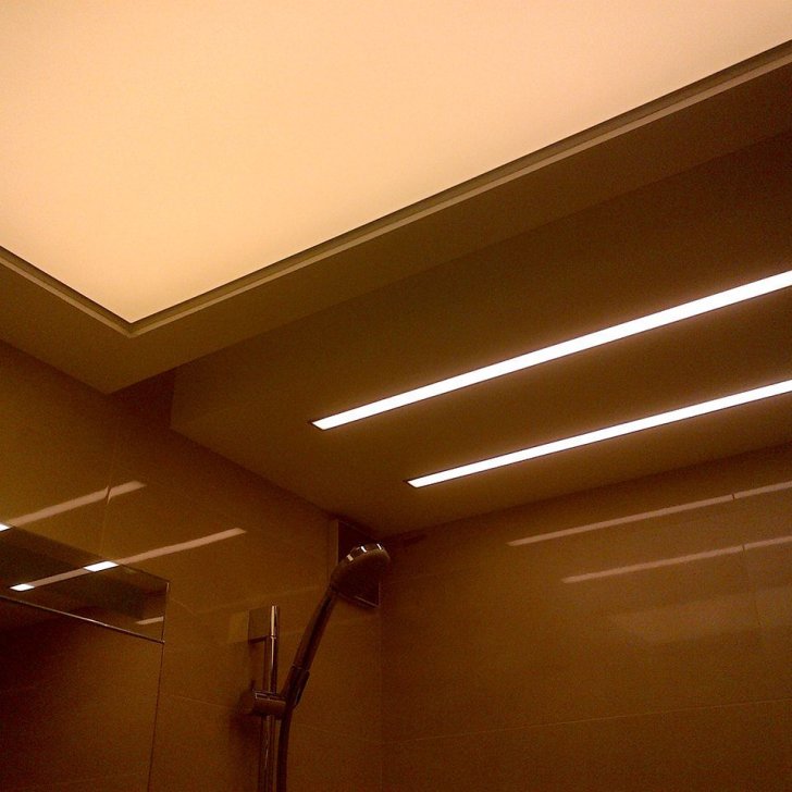 Световые линии, выполненные с помощью алюминиевого профиля, вмонтированного в короба или подвесные потолки из гипсокартона, используются в прихожей, гостиной и зоне душа в санузле. Основное же освещение в санузле обеспечивается с помощью равномерно светящегося потолка. Светодиодная лента наклеивается с определённым шагом на потолок, который потом закрывается листом специального материала. В итоге получается очень мягкий, приятный для глаз свет.