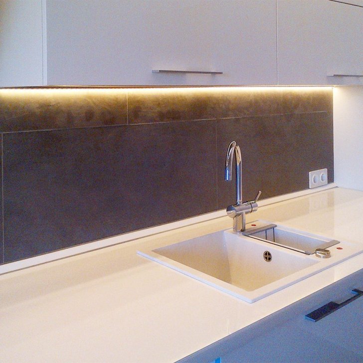 Не осталась без внимания и кухня. С помощью светодиодной ленты, аккуратно оформленной в алюминиевый профиль, устроена эффектная подсветка рабочей зоны.