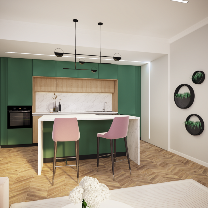 На контрасте с тонкими графичными линиями, в проекте использовались круглые потолочные светильники, а также закарнизная подсветка.