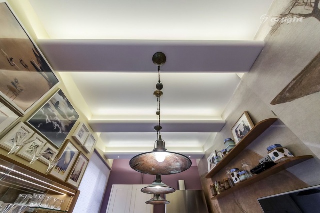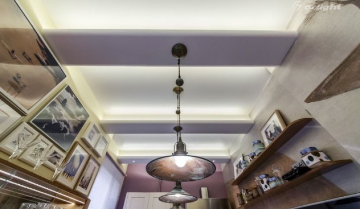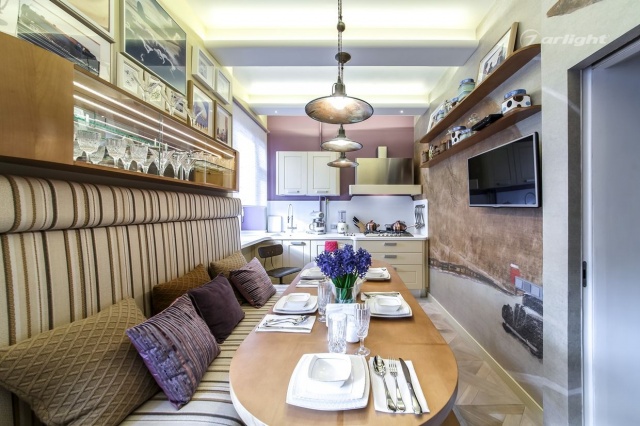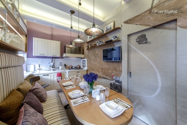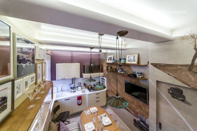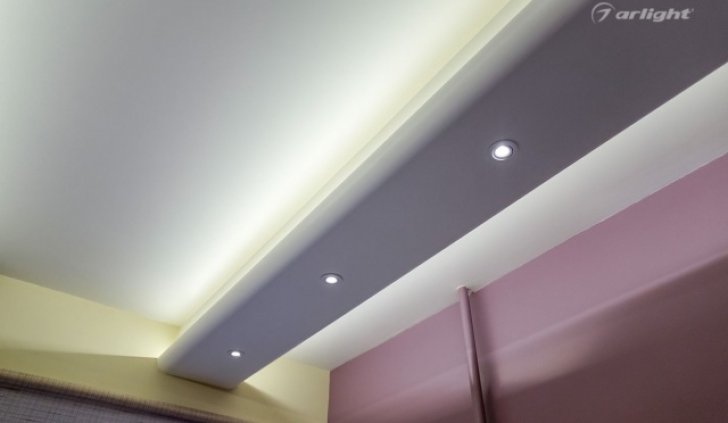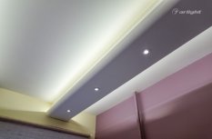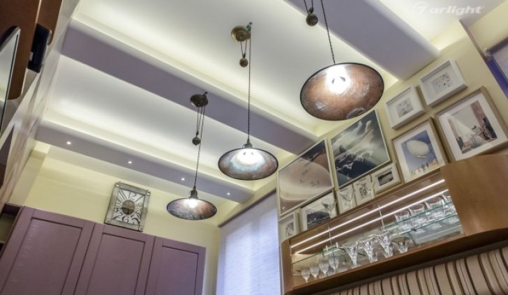 Каждая балка оформлена светодиодной лентой Arlight. Закарнизная подсветка делает визуально конструкции легче и является значимой частью основного освещения.