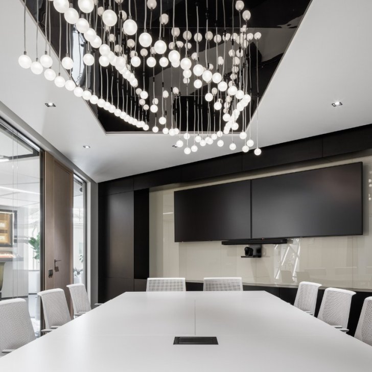В ряде переговорных комнат использованы функциональные источники освещения, которые гармонично сочетаются с современными люстрами. Шарообразные детали придают пространству легкости.