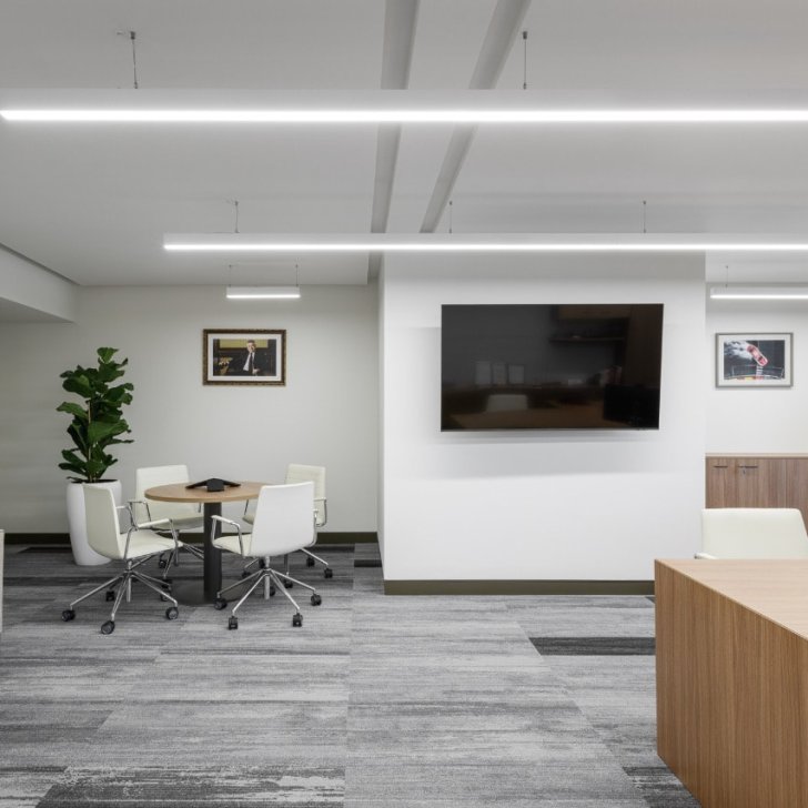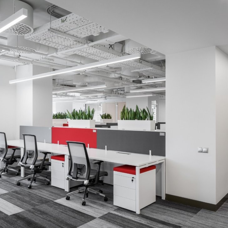 В настоящее время для освещения офисных помещений часто используют трековые системы, и данный проект не исключение. В открытой зоне офиса трековая система совместно с подвесными линейными светильниками гармонично вписывается в потолки с открытыми коммуникациями. Однако интерьер остается аккуратным и сдержанным благодаря белому цвету, который выбрали в качестве основного.