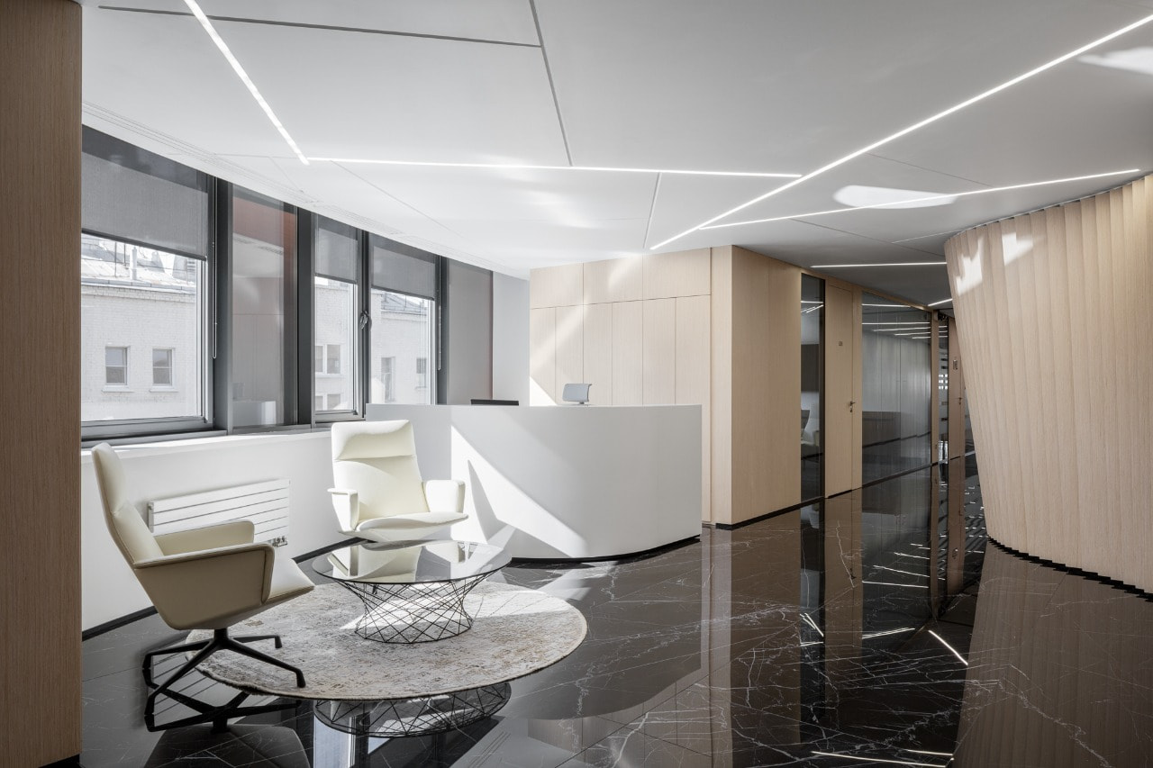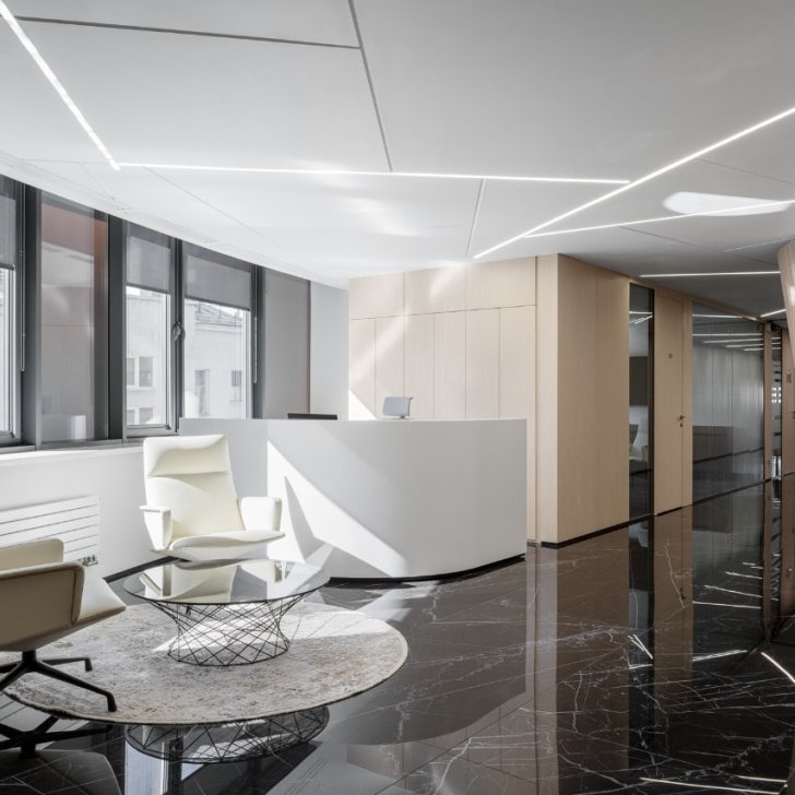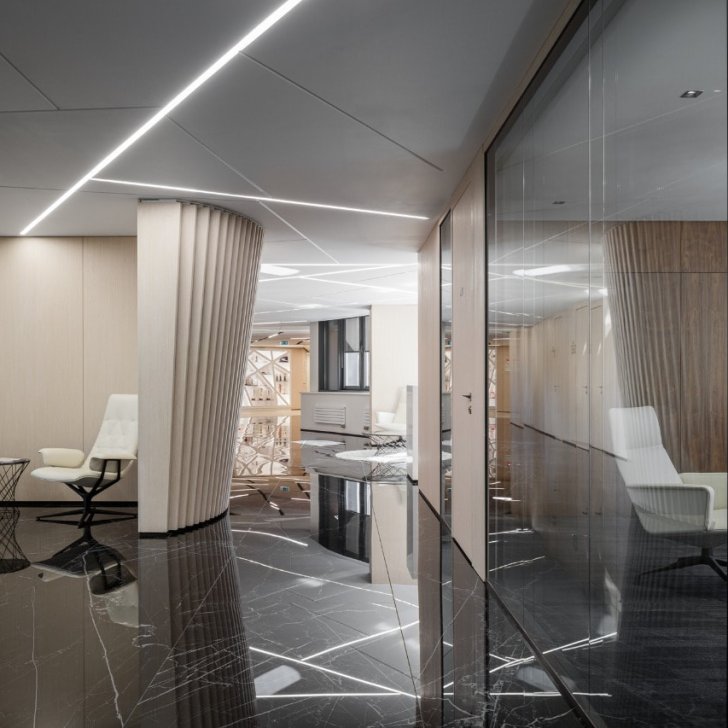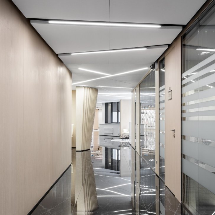 Эргономично был продуман вид и функционал каждого помещения. Хаотичную геометрическую композицию составили из световых полос. С одной стороны, нейтральные белые световые линии (4000 К) создают строгий вид, с другой стороны, их асимметричное расположение подчеркивают комфорт.
