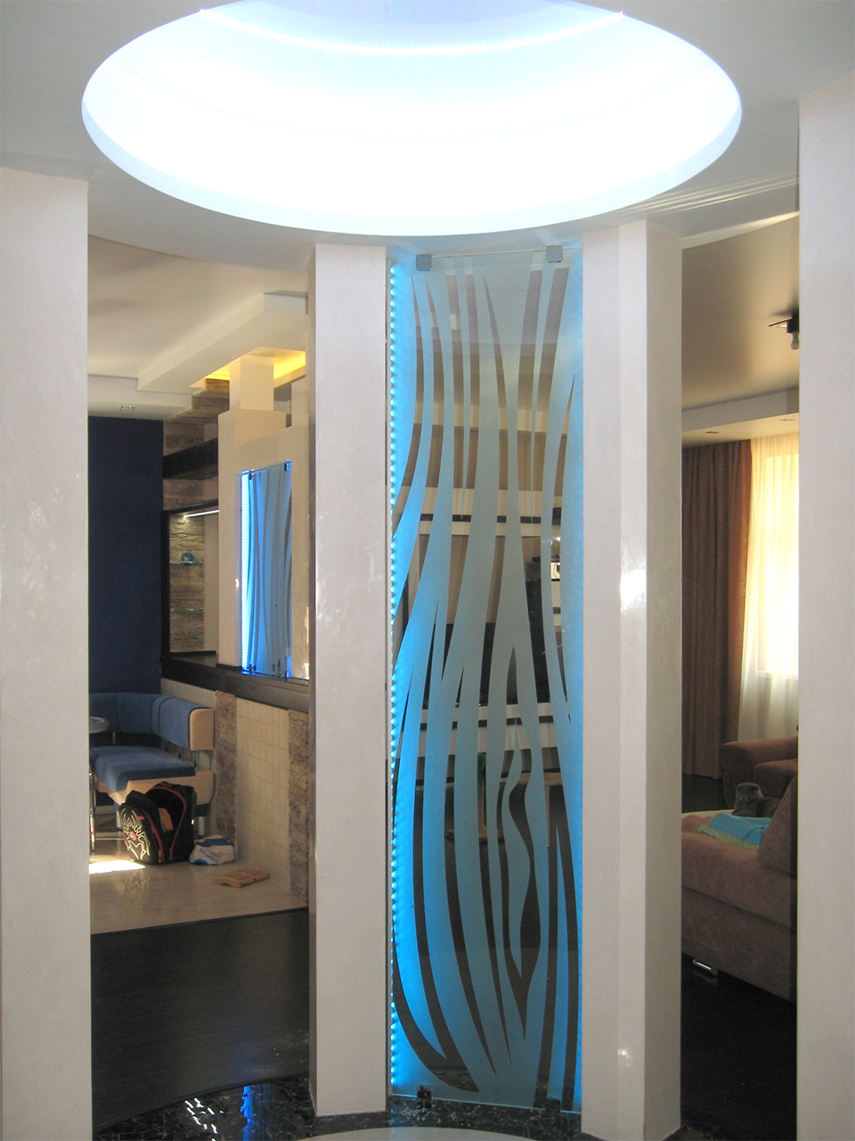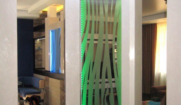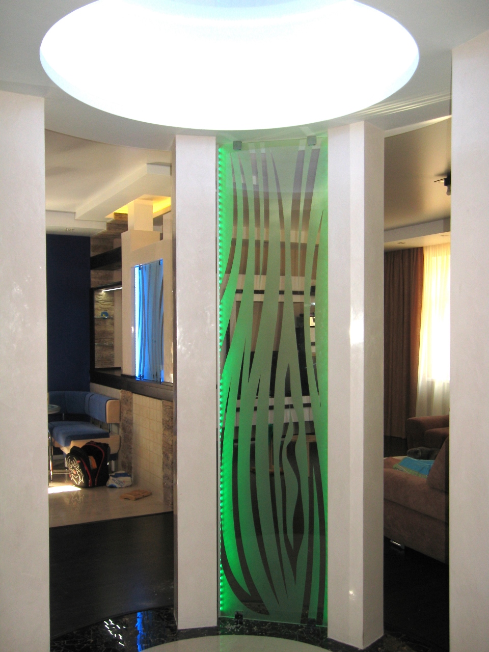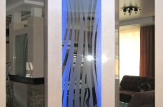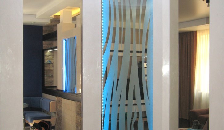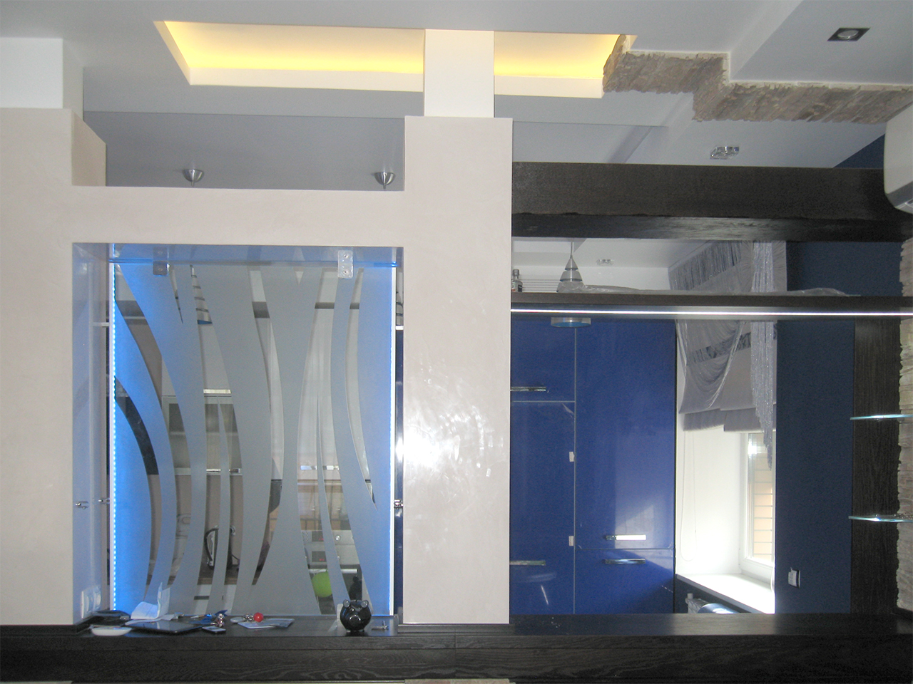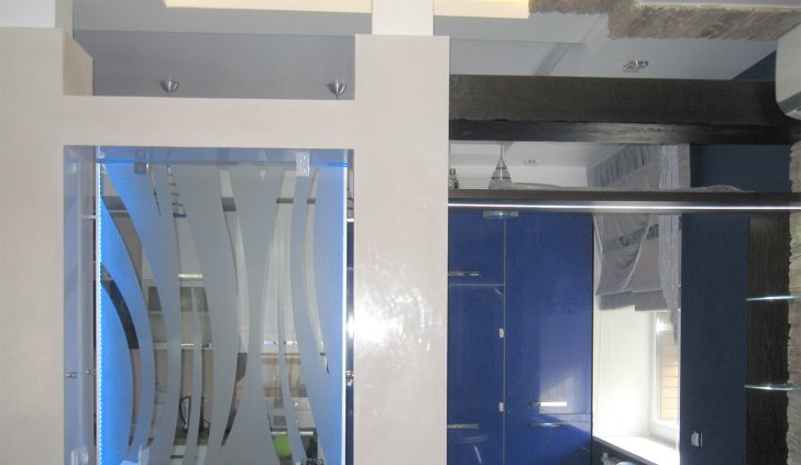 В нескольких зонах квартиры устроены гипсокартонные конструкции, для посдветки которых использовались многоцветные RGB-ленты. Помимо потолочных ниш, дополнительно установлена подсветка декоративных стеклянных конструкций. Сочетание узоров прозрачного и матового стекла с цветным освещением создаёт красивые переливы света.