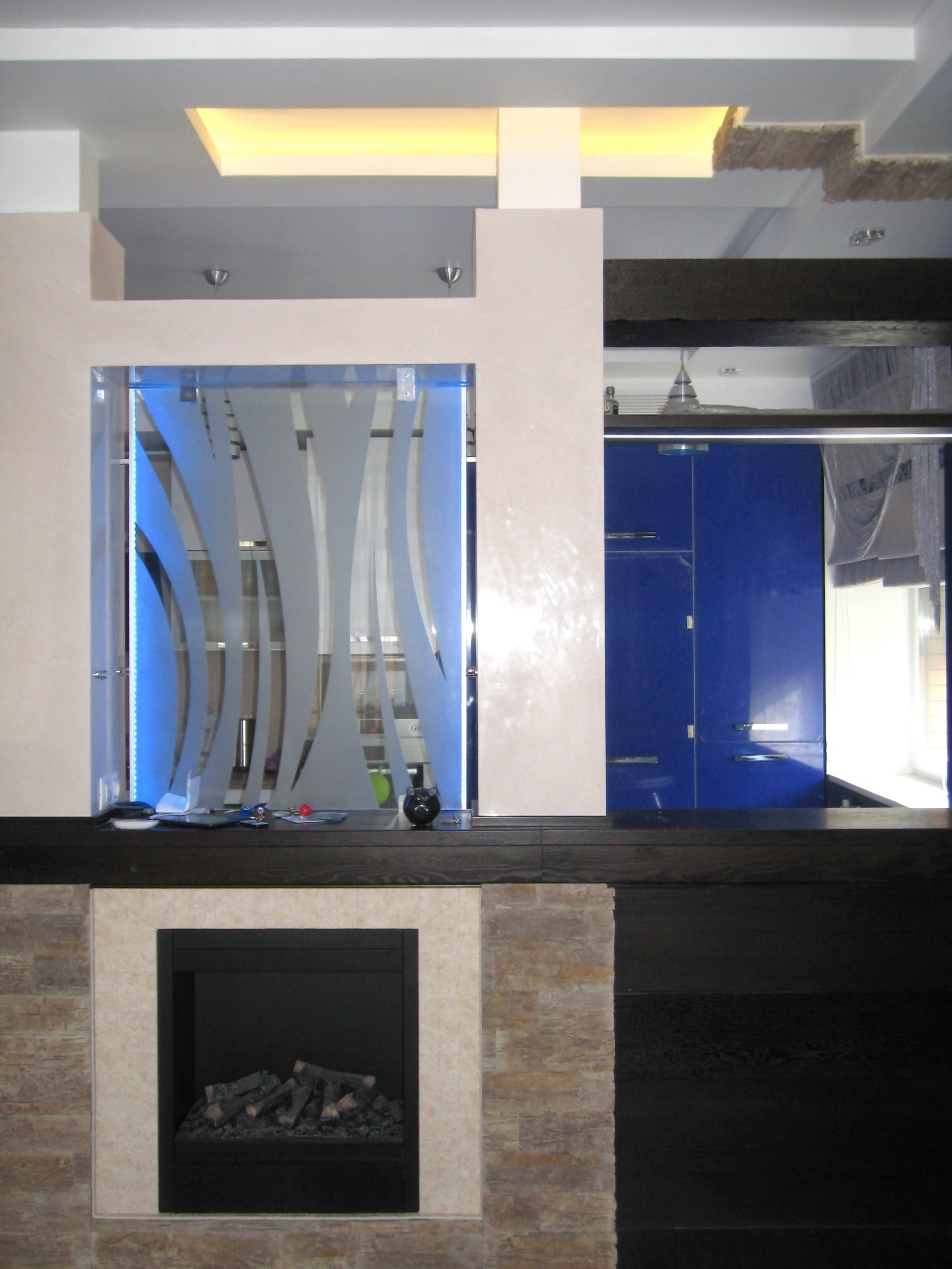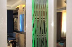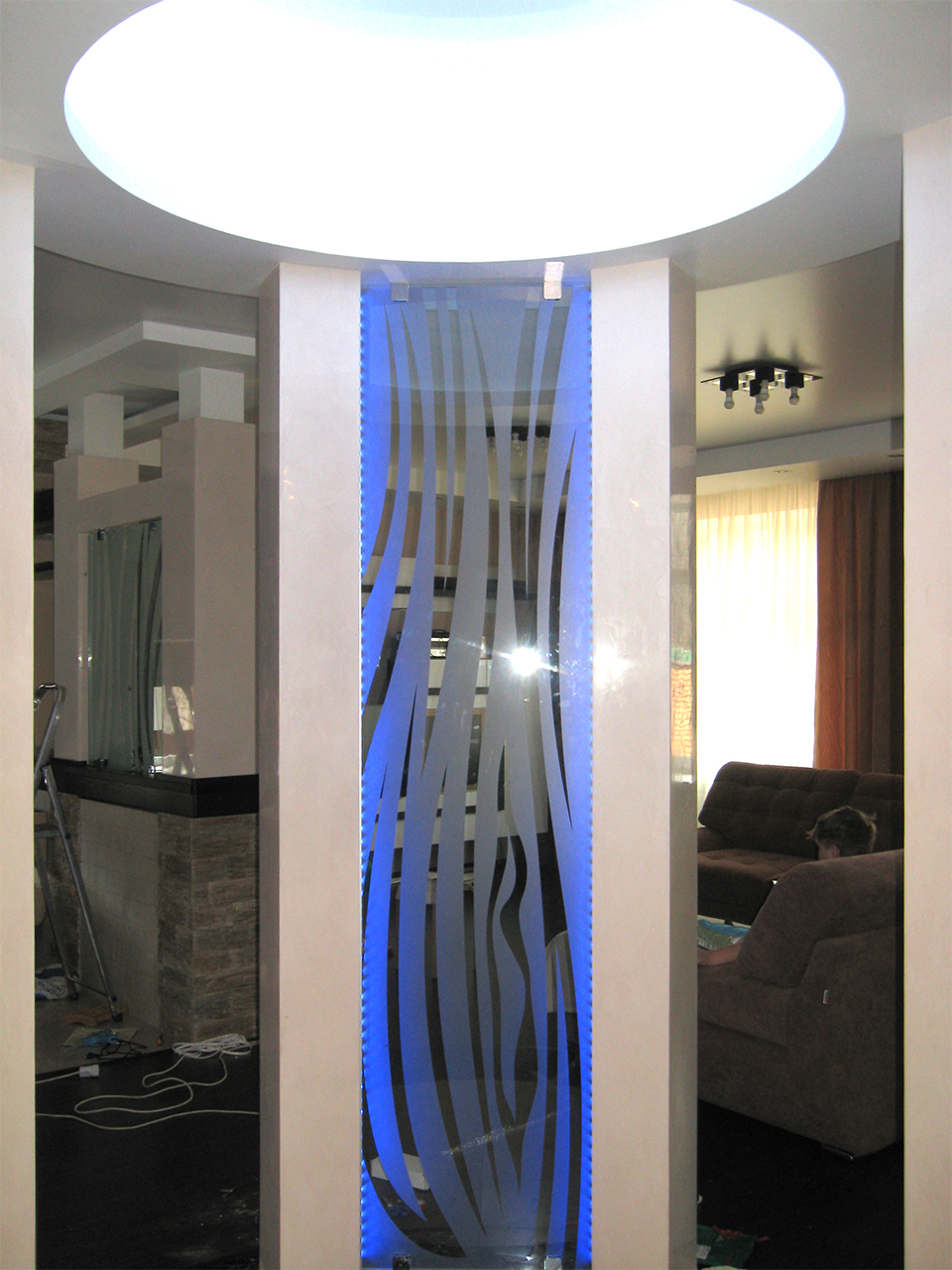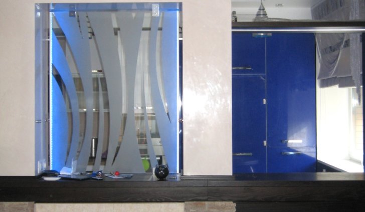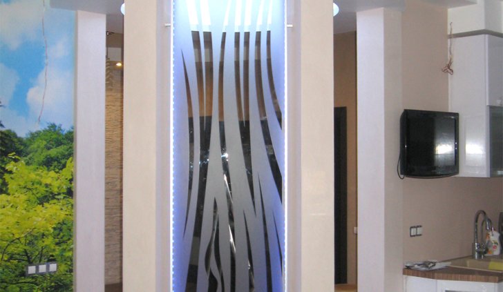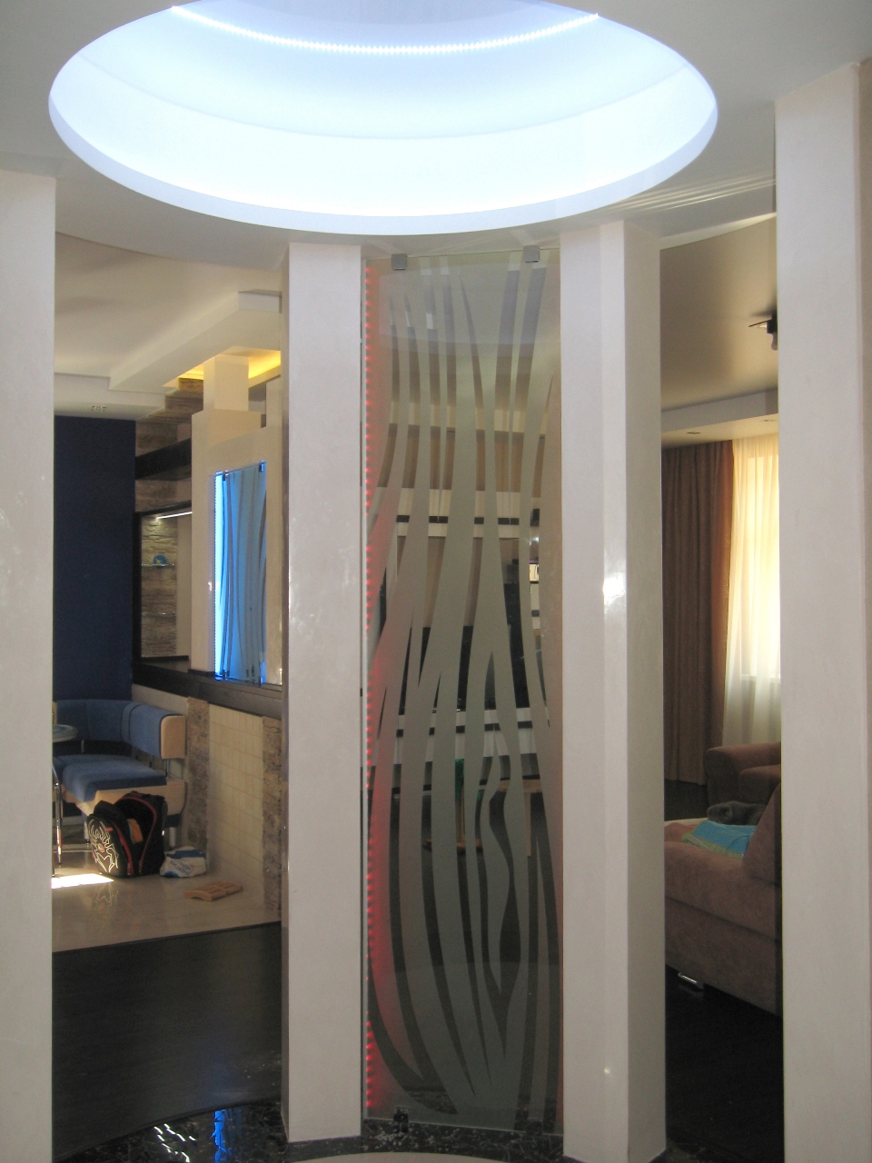 В нескольких зонах квартиры устроены гипсокартонные конструкции, для посдветки которых использовались многоцветные RGB-ленты. Помимо потолочных ниш, дополнительно установлена подсветка декоративных стеклянных конструкций. Сочетание узоров прозрачного и матового стекла с цветным освещением создаёт красивые переливы света.
