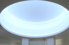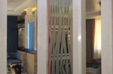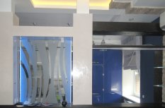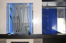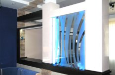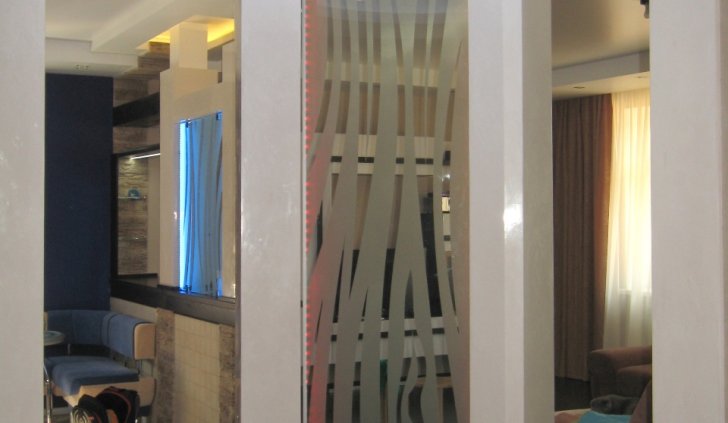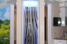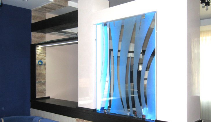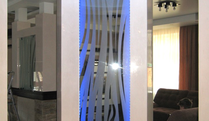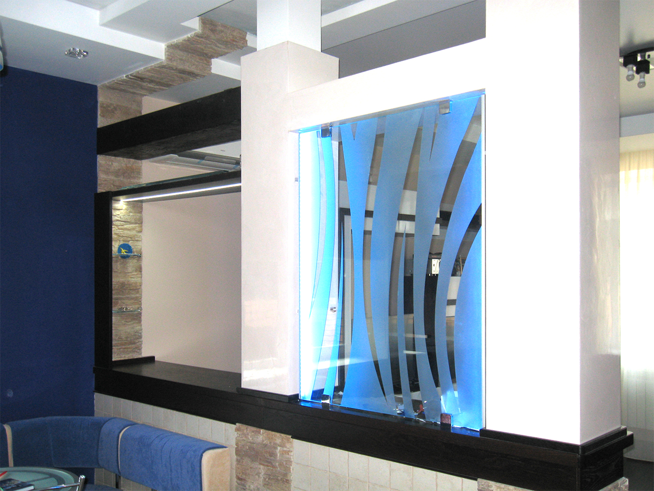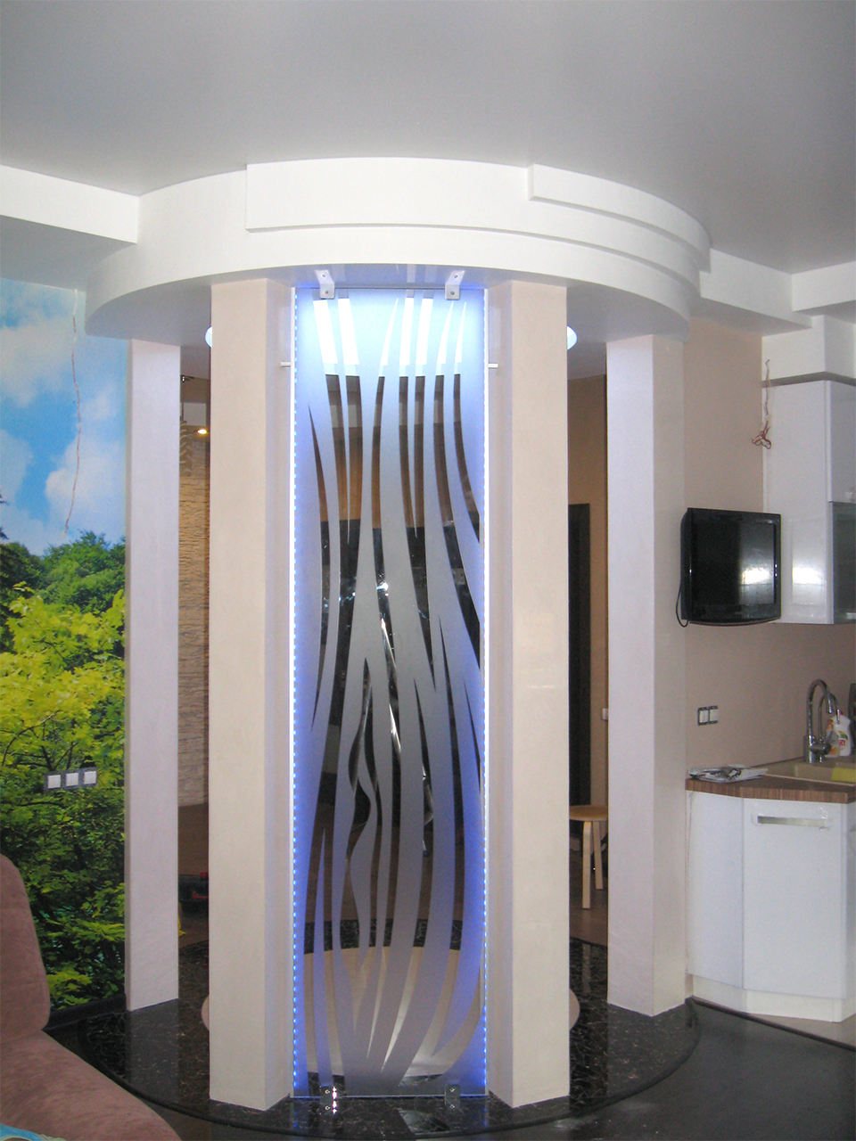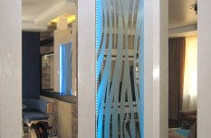 В нескольких зонах квартиры устроены гипсокартонные конструкции, для посдветки которых использовались многоцветные RGB-ленты. Помимо потолочных ниш, дополнительно установлена подсветка декоративных стеклянных конструкций. Сочетание узоров прозрачного и матового стекла с цветным освещением создаёт красивые переливы света.