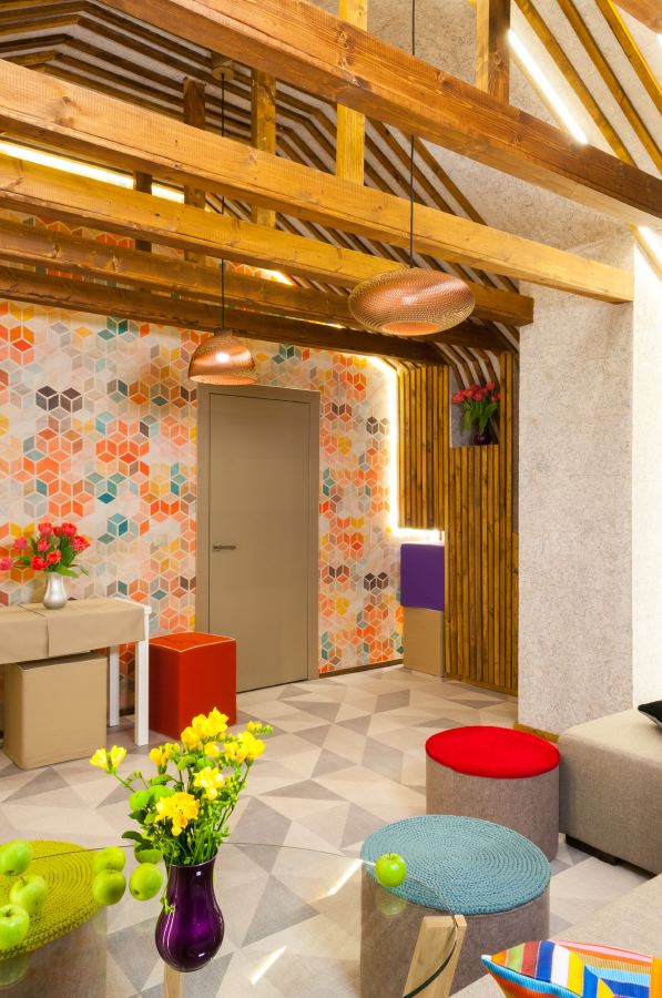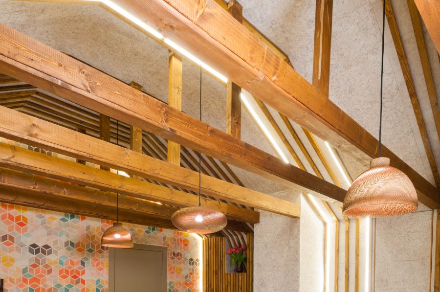 Такой интерьер должен быть светлым и подчеркивать общий стиль помещения, поэтому освещению было уделено особое внимание. Для освещения этажа использованы люстры и, так называемые, линии света. Эти световые линии расположились вдоль деревянных реек на стенах и потолке. А благодаря тому, что линии не имеют видимых стыков при переходе со стен на потолок, они смотрятся особенно эффектно.