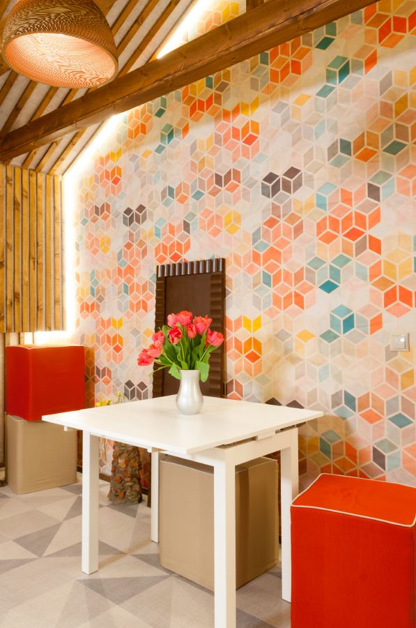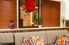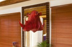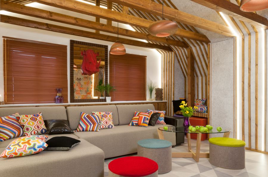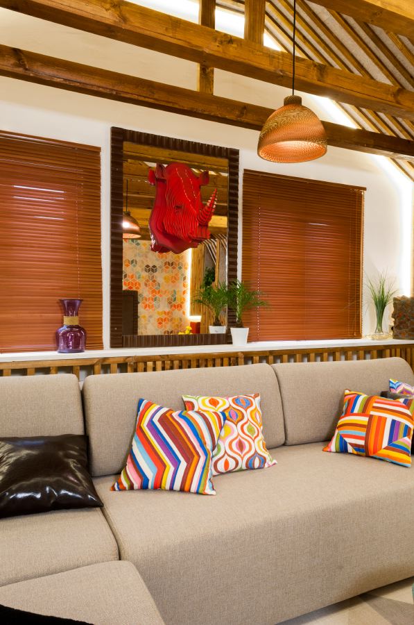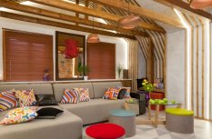 Проект переделки второго этажа дачного дома получил название "Дачное сафари" и был выполнен в африканском стиле. В интерьере преобладают тёплые тона, присутствуют яркие красочные элементы, в нём широко используются натуральные материалы.