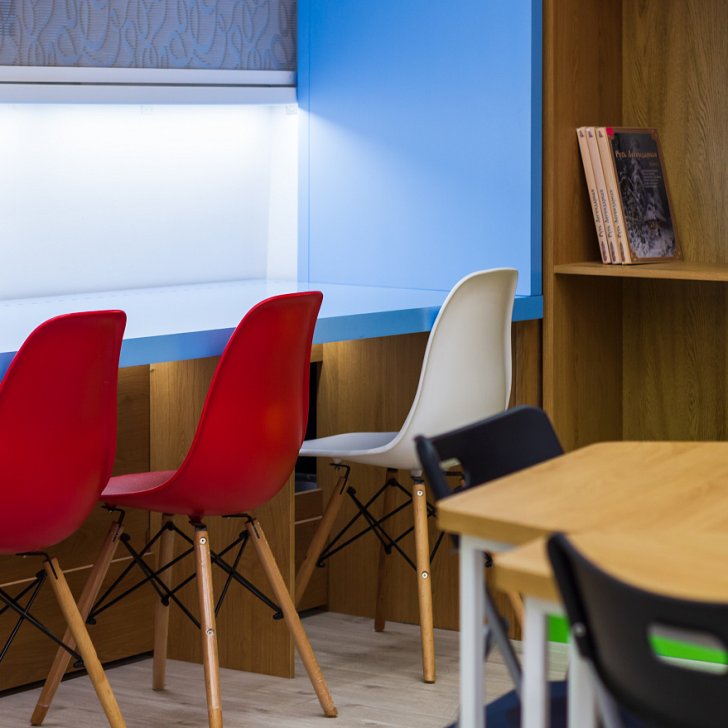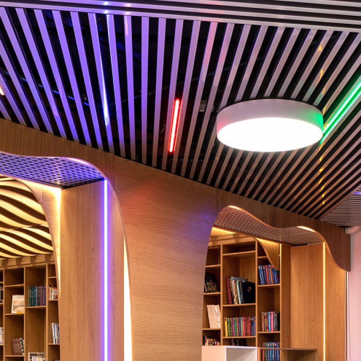 Центральная детская библиотека приобрела новый облик, который выстраивался в том числе благодаря масштабному проекту освещения. Основные идеи вторят друг другу и появляются в самых разных помещениях: свет, будто проникающий сквозь окна или кессоны на потолке и деревянные рейки с тёплым мягким светом.