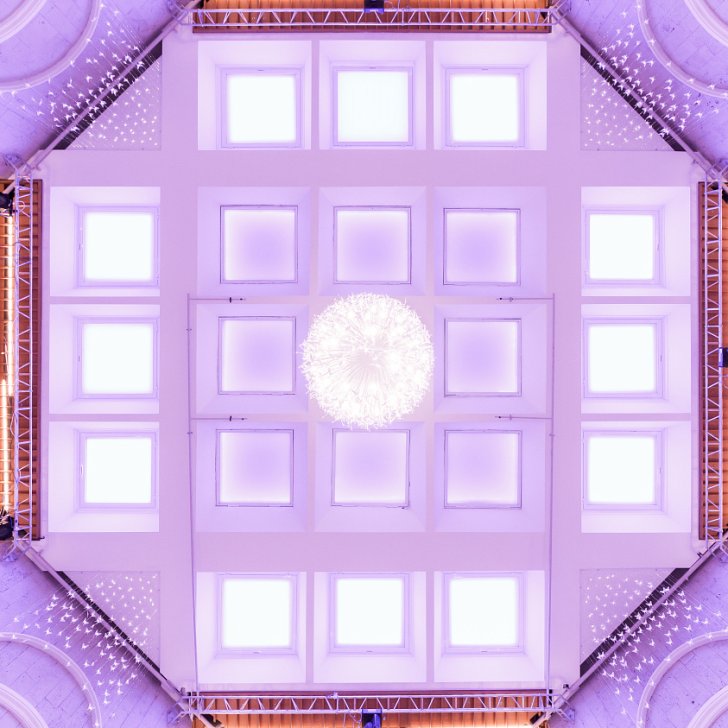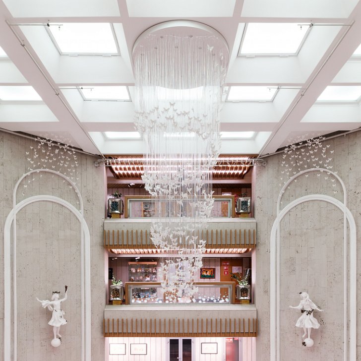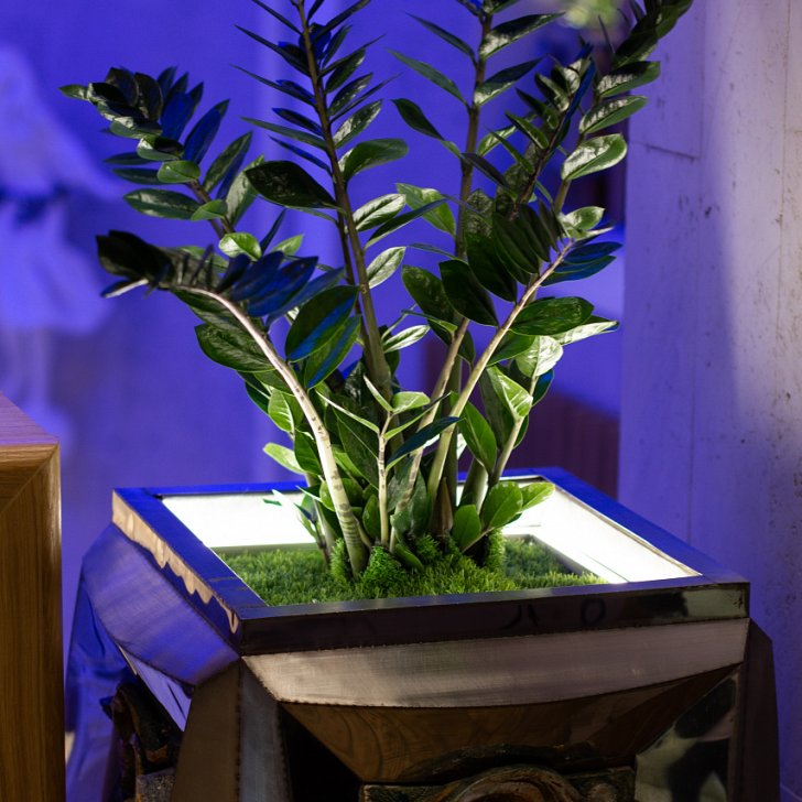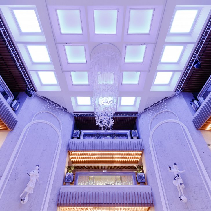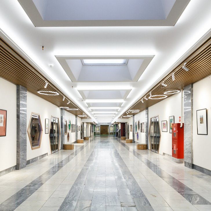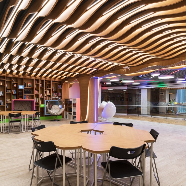 Центральное открытое пространство библиотеки – холл высотой в несколько этажей, смотрится ещё эффектнее благодаря освещению: мягкому рассеянному свету внутри кессонов на потолке, а также будто обрамляющих его потолков с деревянными конструкциями, сквозь которые пробивается свет, повторяющимися на каждом из этажей. Здесь подсвечены и стеклянные ограждения, и даже кашпо с комнатными растениями.