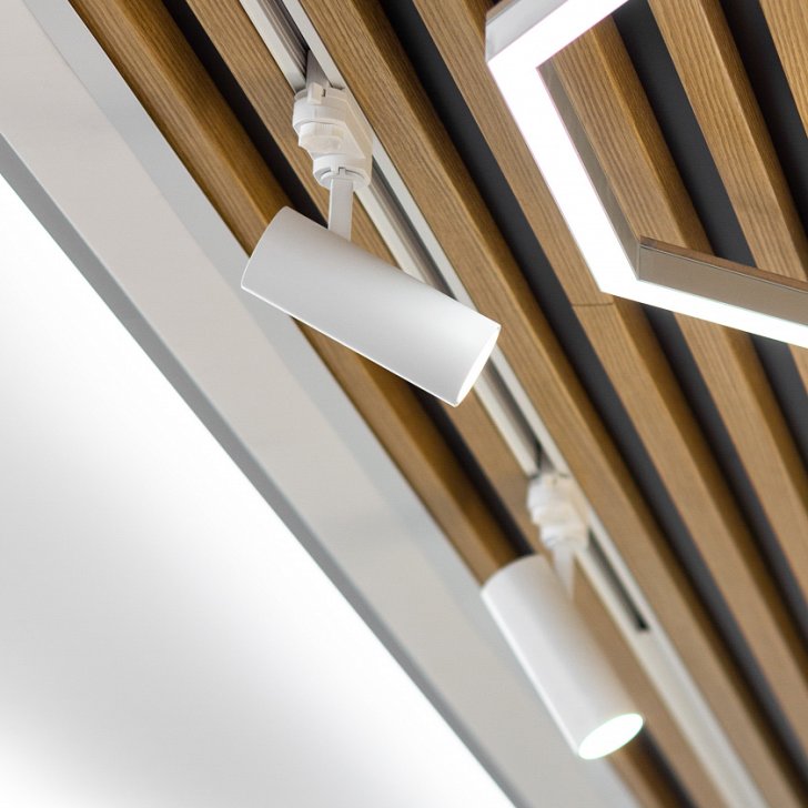 В коридорах в качестве основного освещения используется засветка потолка, которая повторяет контуры помещения и ниш в потолке, а также равномерно засвечивает пространство внутри них. Кроме того, в качестве дополнительно освещения используются треки со светодиодными светильниками и небольшие подвесные светильники в виде колец.