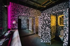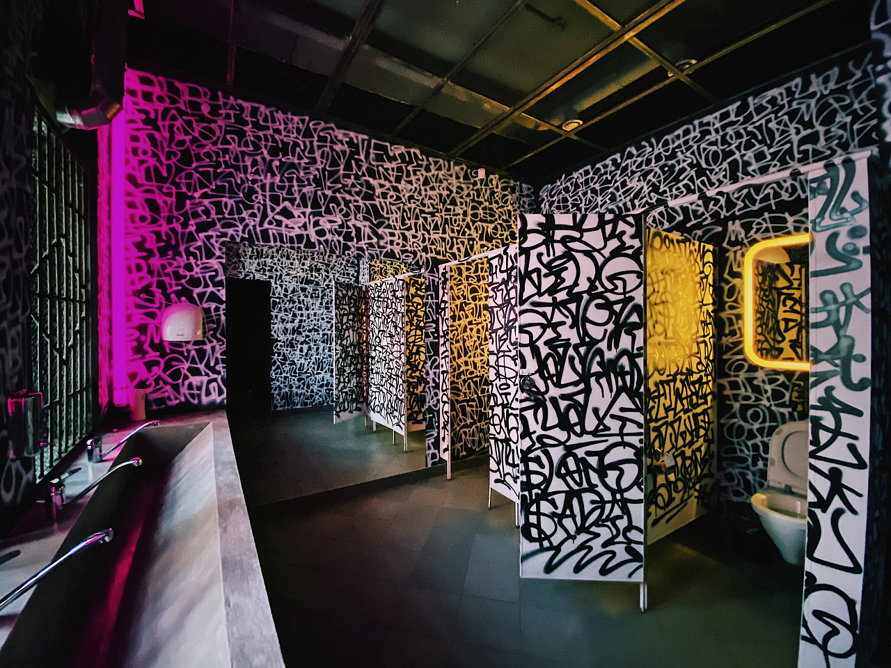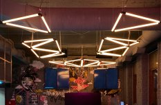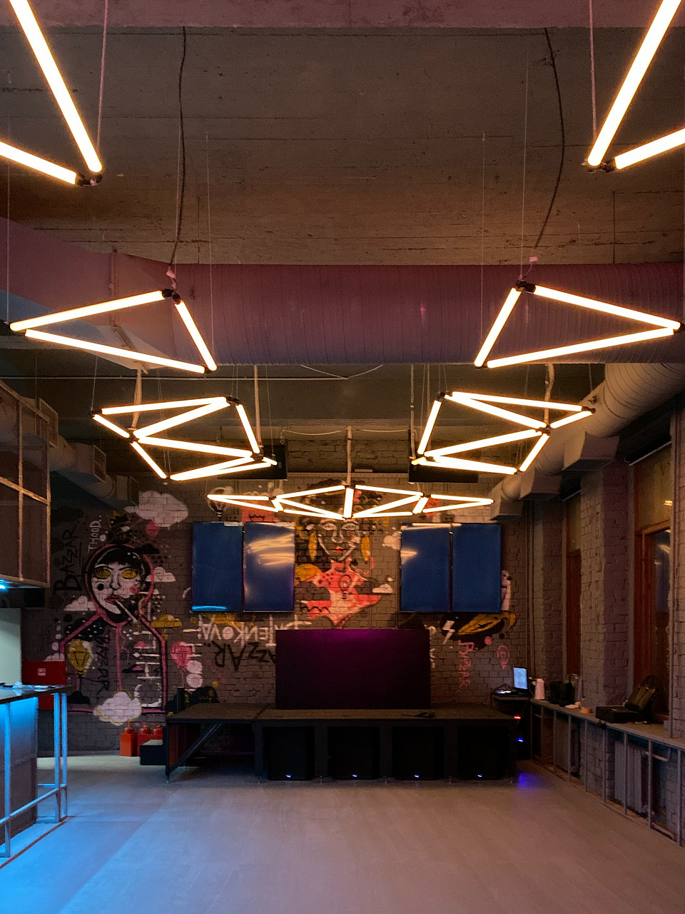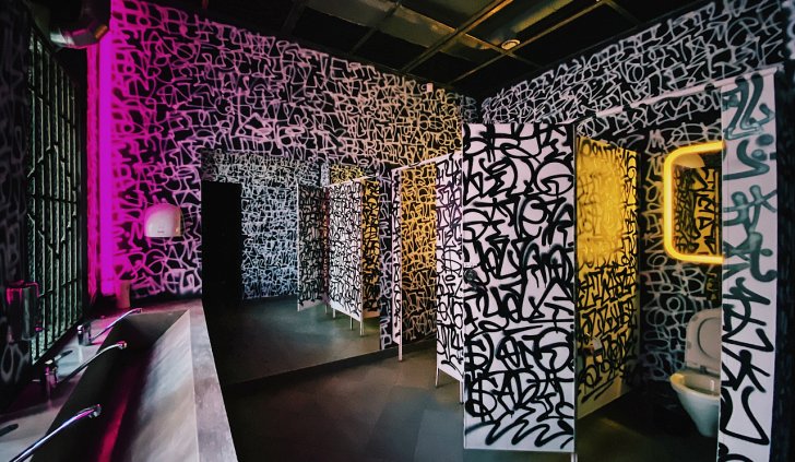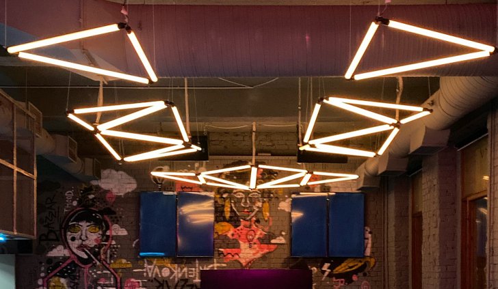 Попадая внутрь клуба, мы будто оказываемся на не самых благополучных, но таких колоритных улицах ночного города. Разноцветная светодиодная подсветка помогает подчеркнуть мрачную и притягательную эстетику интерьера. Кирпичные стены, граффити, решётки и трубы, - со всем этим гармонично сочетаются лаконичные подвесные светильники, отсылающие нас к уличному или промышленному освещению.