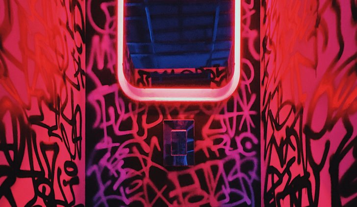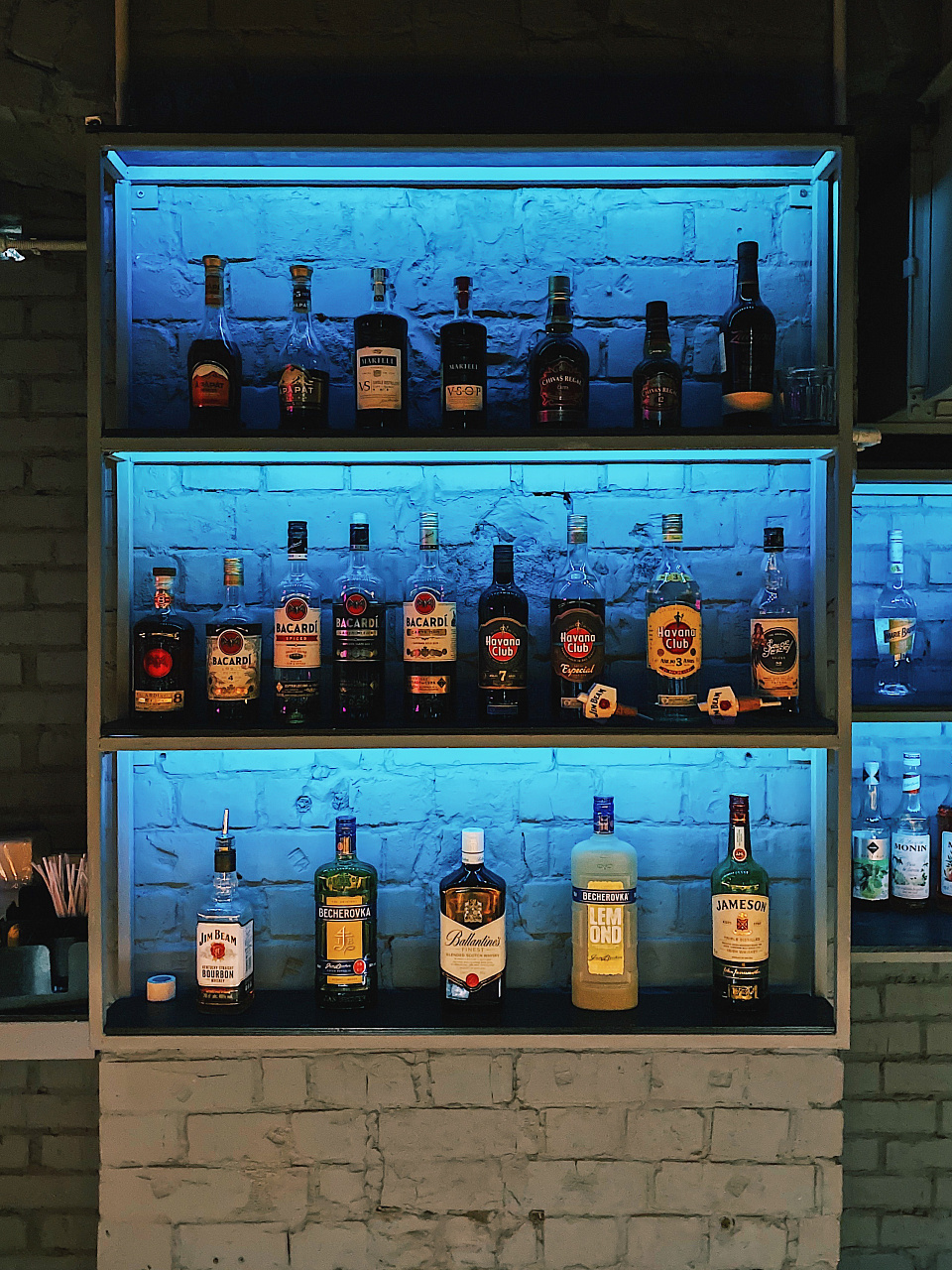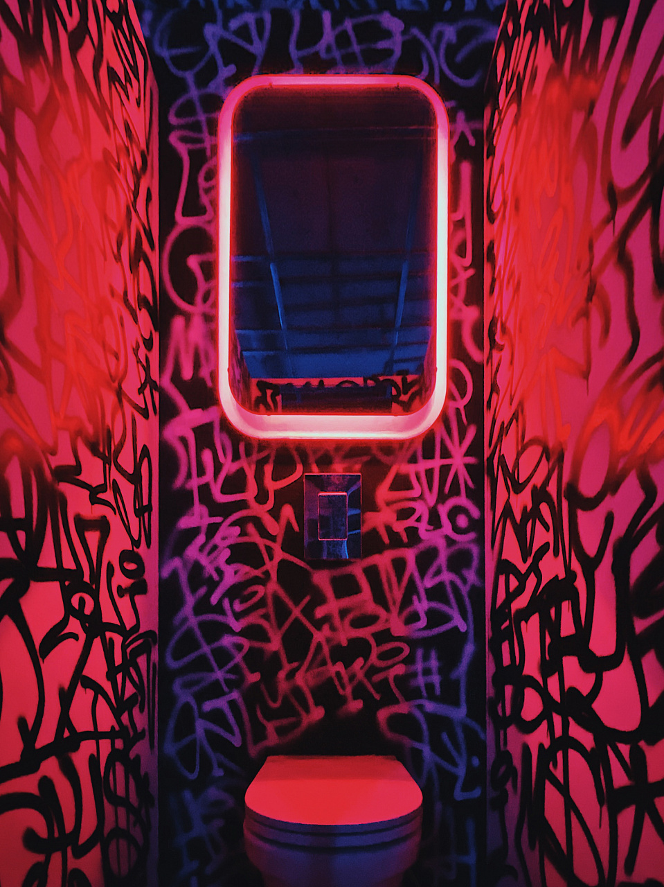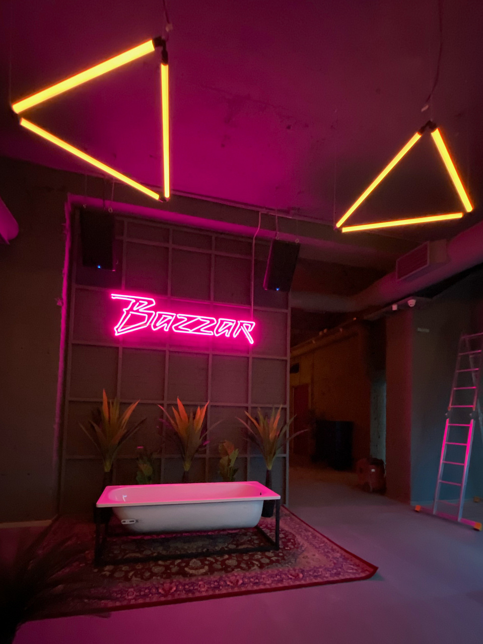 Попадая внутрь клуба, мы будто оказываемся на не самых благополучных, но таких колоритных улицах ночного города. Разноцветная светодиодная подсветка помогает подчеркнуть мрачную и притягательную эстетику интерьера. Кирпичные стены, граффити, решётки и трубы, - со всем этим гармонично сочетаются лаконичные подвесные светильники, отсылающие нас к уличному или промышленному освещению.