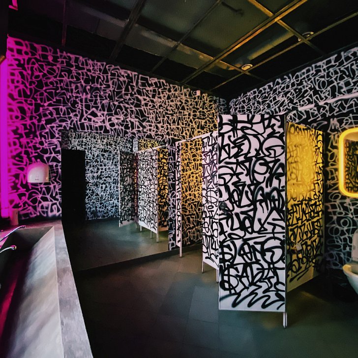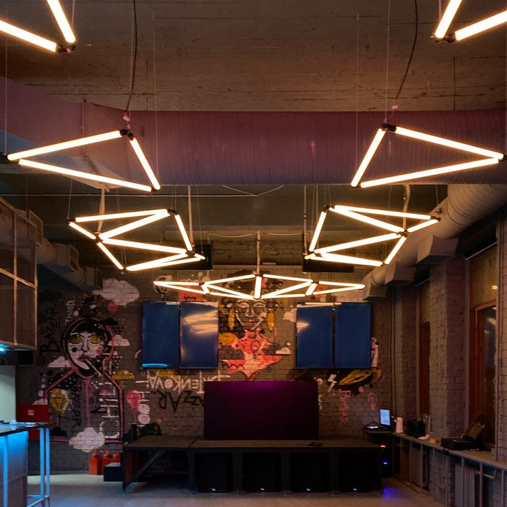 Попадая внутрь клуба, мы будто оказываемся на не самых благополучных, но таких колоритных улицах ночного города.  Разноцветная светодиодная подсветка помогает подчеркнуть мрачную и притягательную эстетику интерьера. Кирпичные стены, граффити, решётки и трубы, - со всем этим гармонично сочетаются лаконичные подвесные светильники, отсылающие нас к уличному или промышленному освещению.