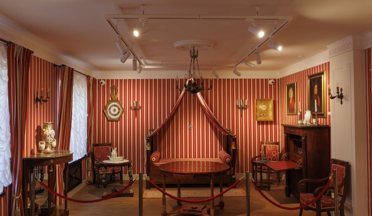 Чтобы ничто не мешало посетителям ощутить себя во дворце наполеоновской эпохи, для освещения были использованы трехфазные трековые светильники GELIOS. Аккуратные цилиндрические светильники и изящные треки не перегружают пространство, а белый цвет оборудования помогает ему слиться с поверхностью потолка. Треки установлены на подвесы, благодаря чему потолок выглядит воздушно на контрасте с массивной экспозицией.