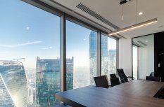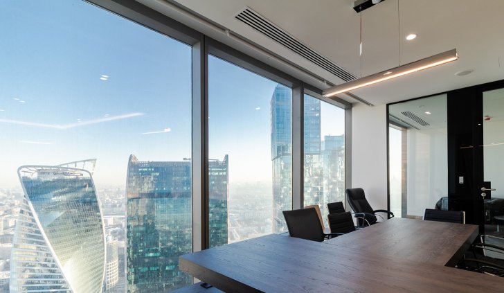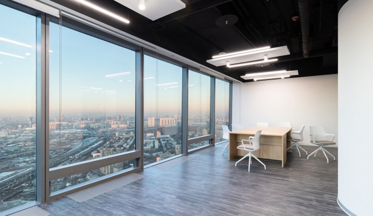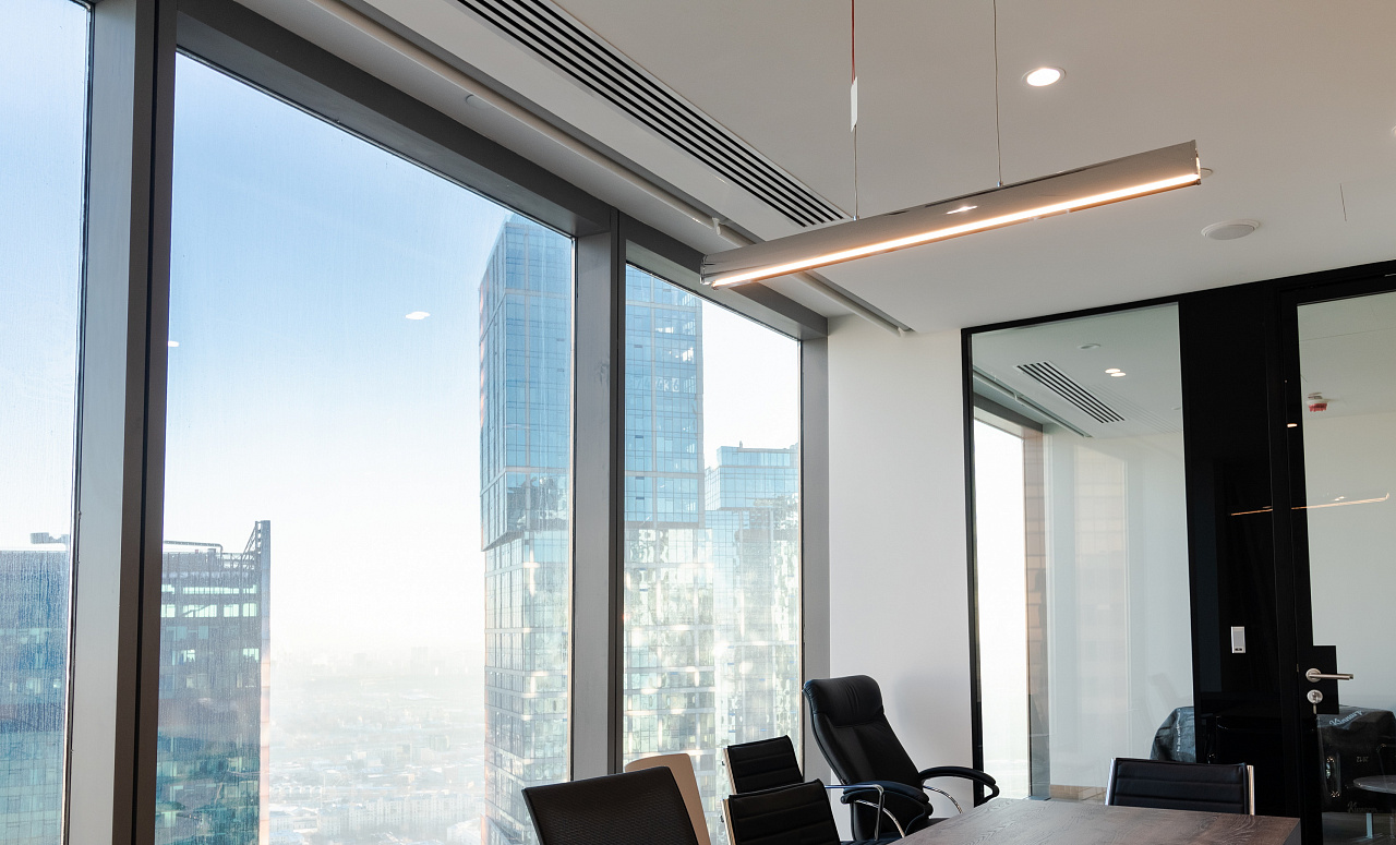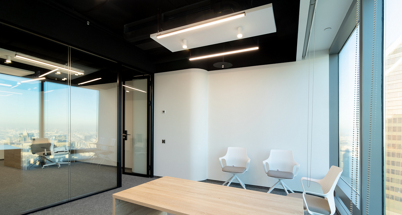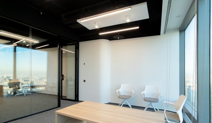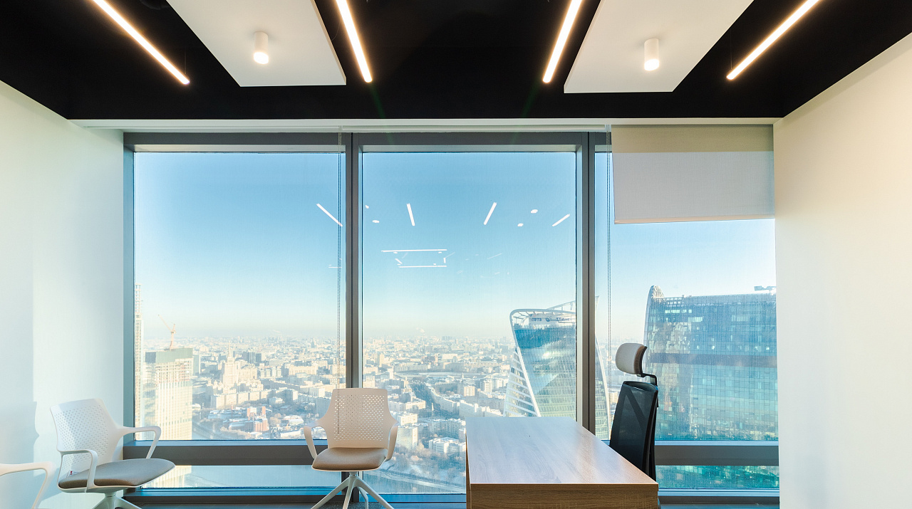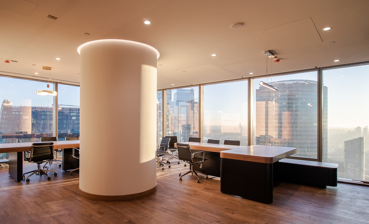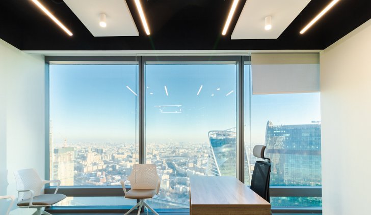 В офисной зоне в Башне Федерация в Москва-сити важную роль в интерьере отвели разнообразному качественному освещению. Основная часть светильников выполнена на базе алюминиевого профиля.