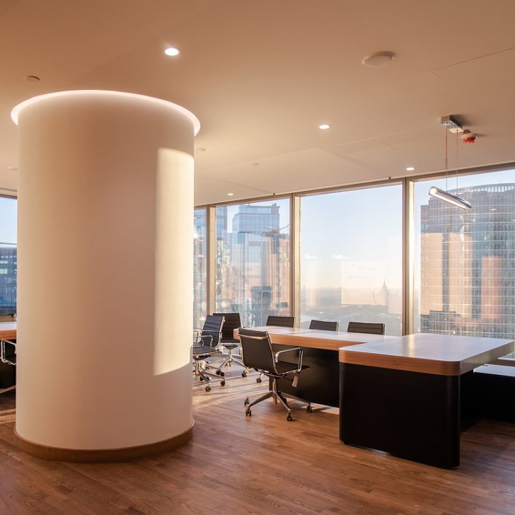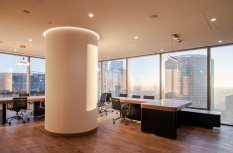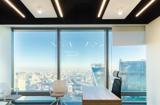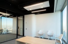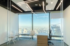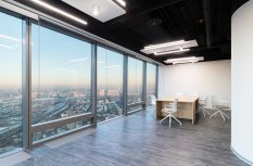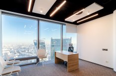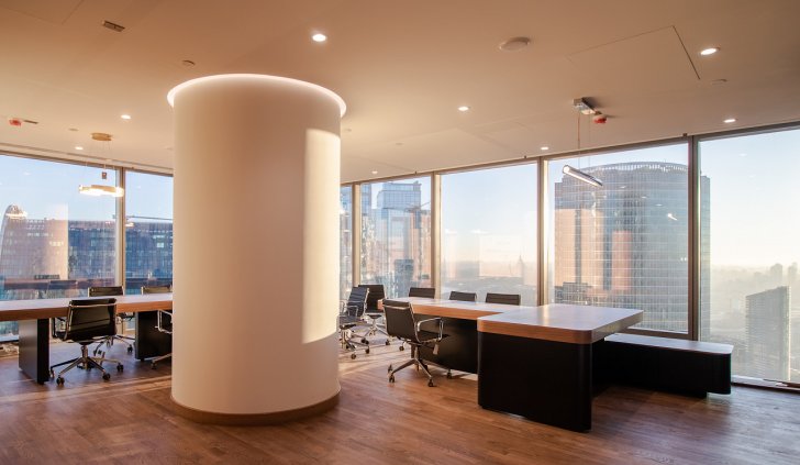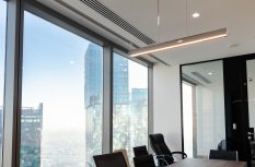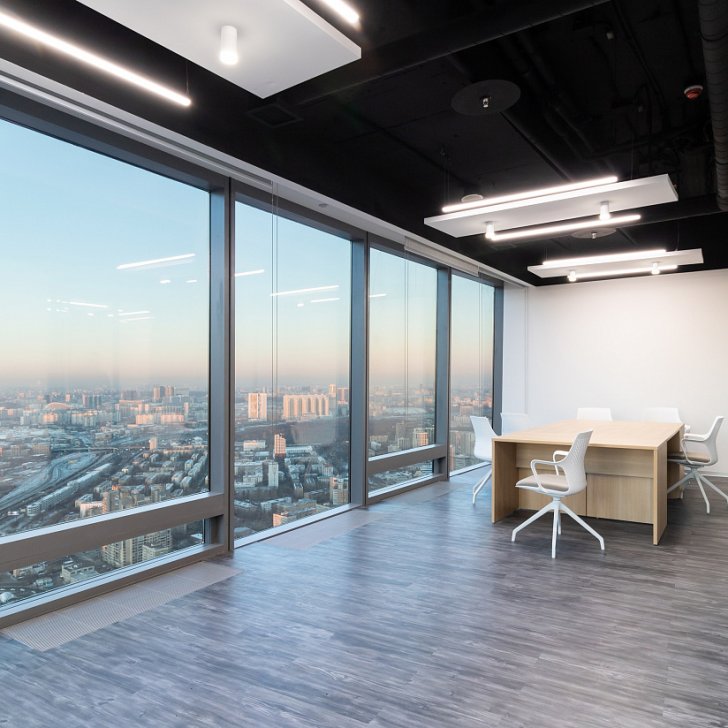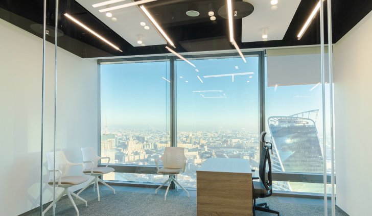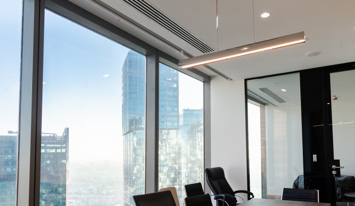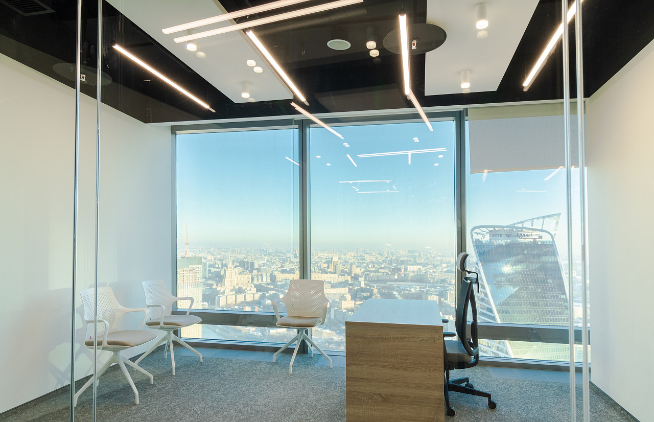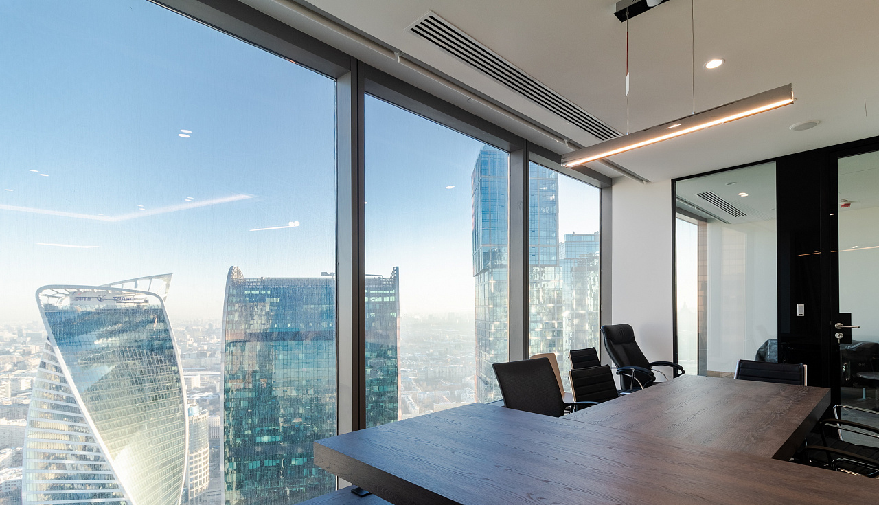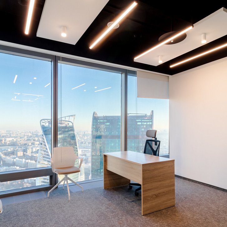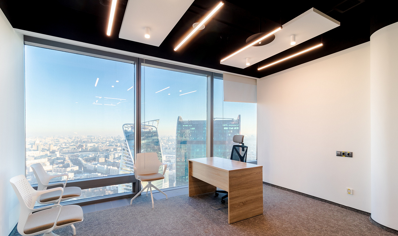 В офисной зоне в Башне Федерация в Москва-сити важную роль в интерьере отвели разнообразному качественному освещению. Основная часть светильников выполнена на базе алюминиевого профиля.