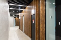 В офисной зоне в Башне Федерация в Москва-сити важную роль в интерьере отвели разнообразному качественному освещению. Основная часть светильников выполнена на базе алюминиевого профиля.