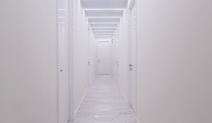 Учитывая высокую мощность ленты (27 Вт/м), ее монтаж необходимо производить на алюминиевый профиль. В данном проекте был выбран широкий алюминиевый профиль, окрашенный в белый цвет SL-LINIA62-F-2500 WHITE. Белый профиль, вмонтированный в белый потолок, сливаются в единое целое. Матовые экраны, которые идут в комплекте с профилем, мягко рассеивают свет. В итоге создается эффект светового потока, струящегося прямо из потолка.