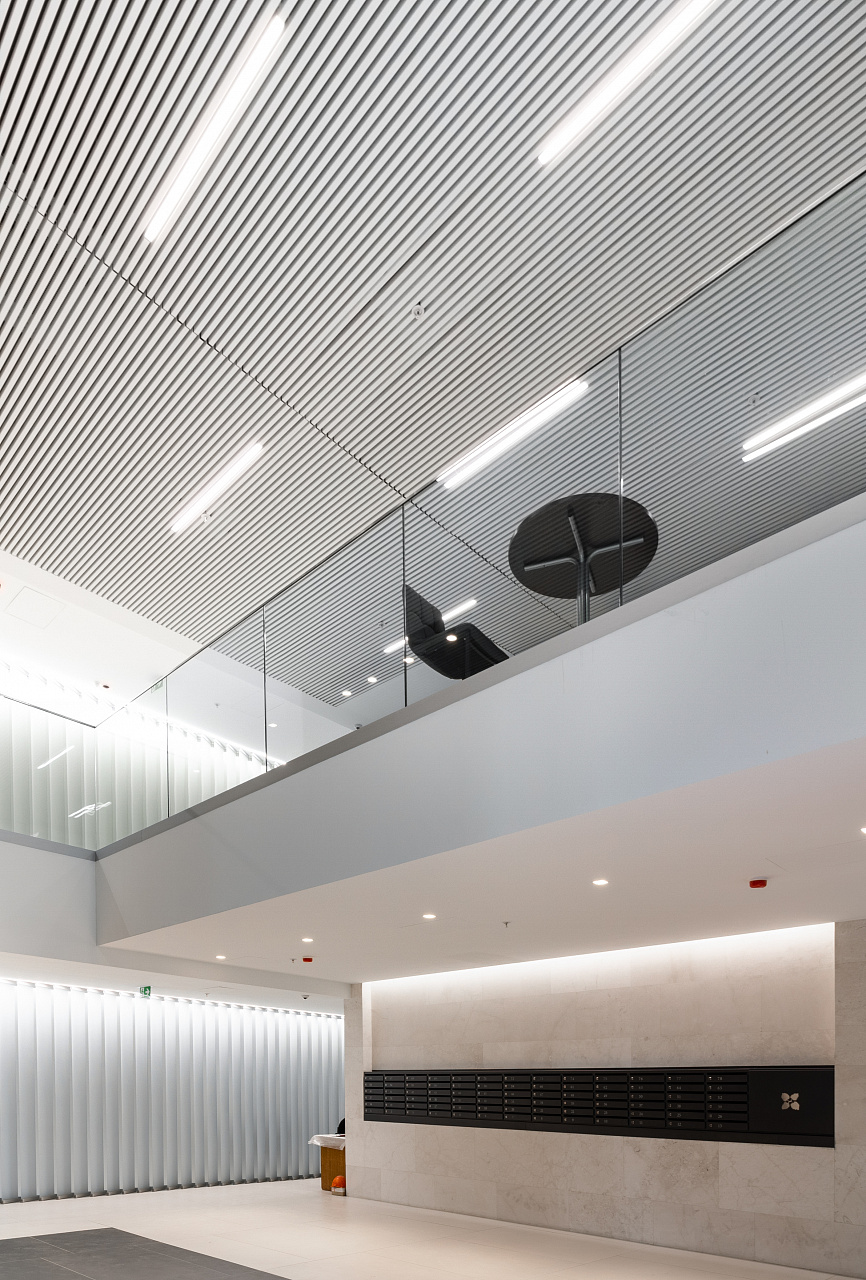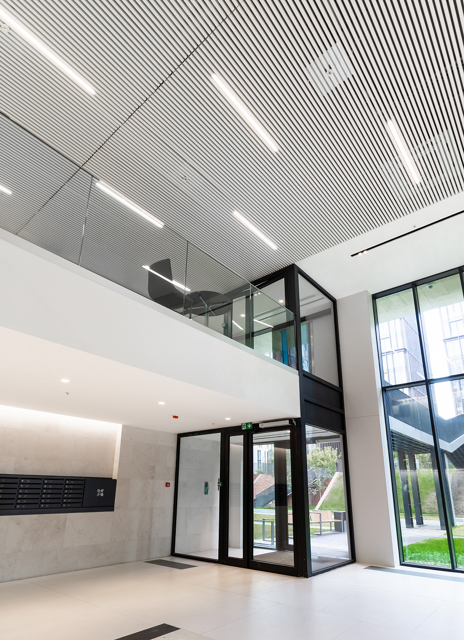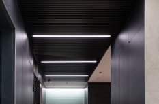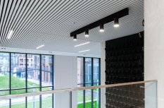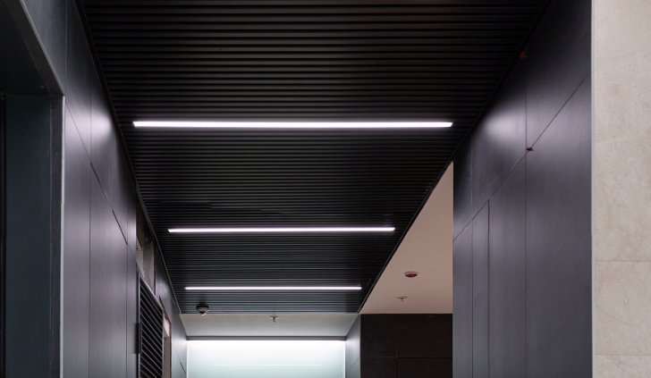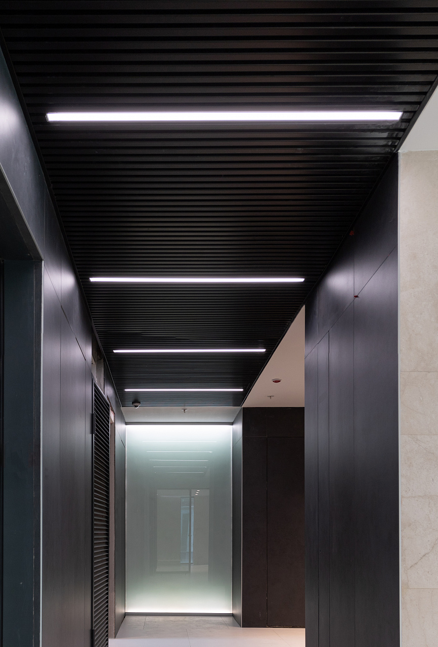 Простые и строгие решения прекрасно сочетаются с минималистичным интерьером холлов. Линейные светильники, созданные с использованием алюминиевых профилей, вмонтированы в реечный потолок. Другая их часть выполнена в чёрном цвете в качестве подвесных светильников, контрастируя со светлым интерьером.