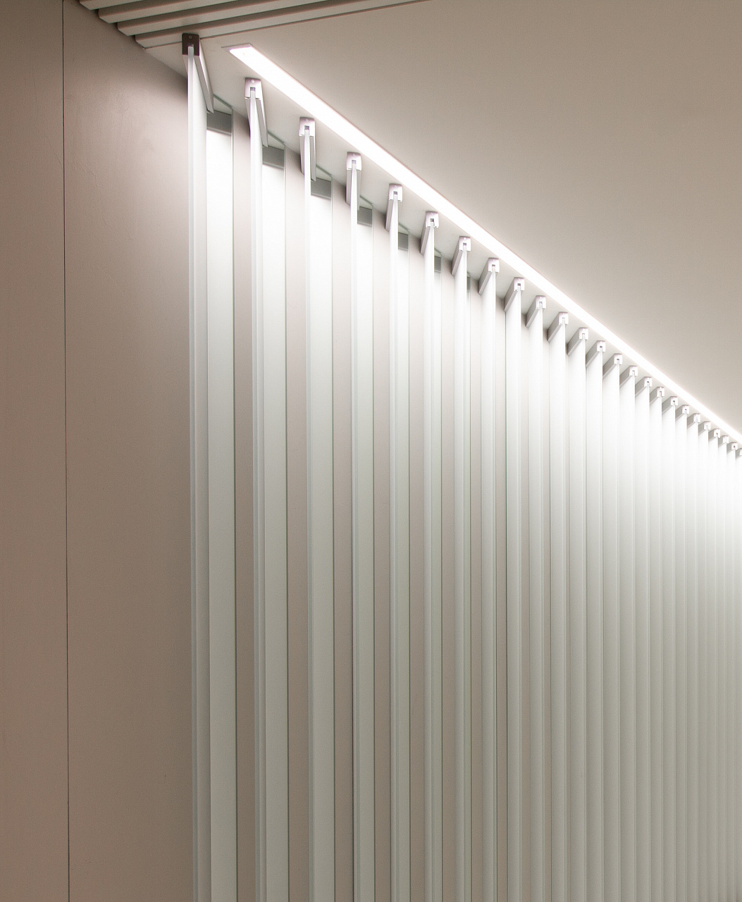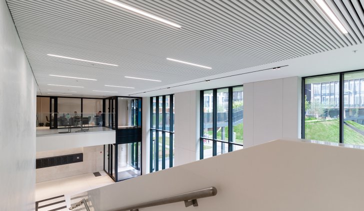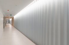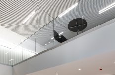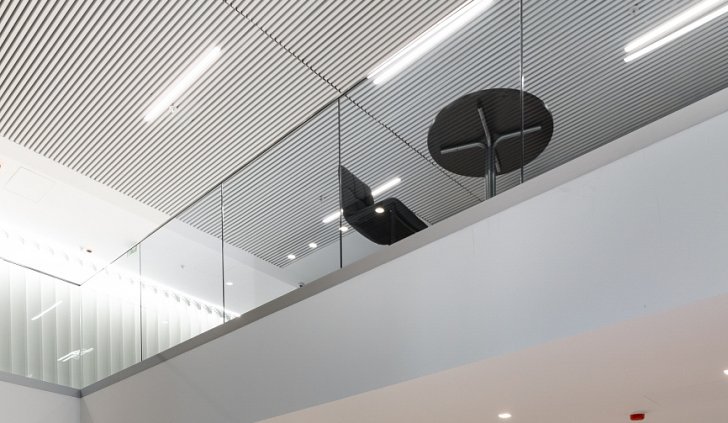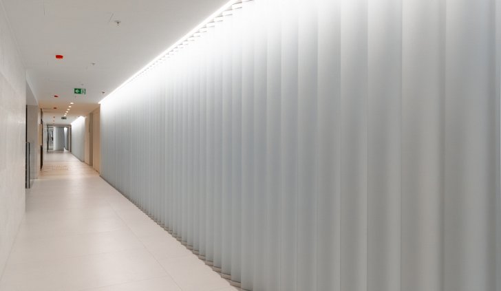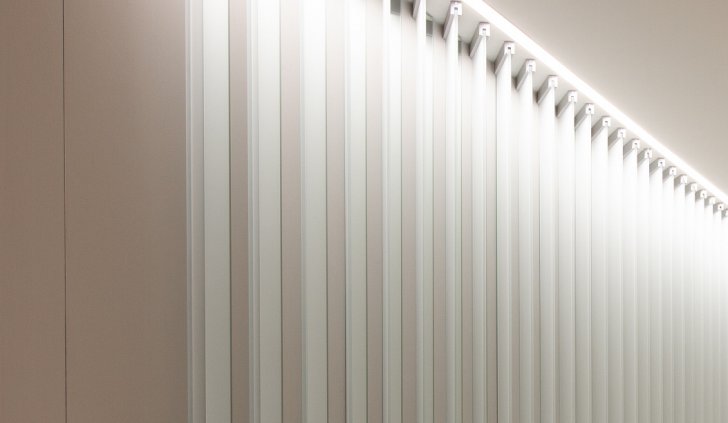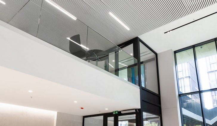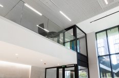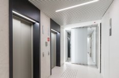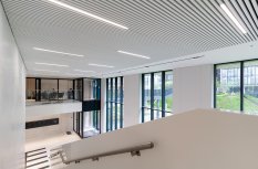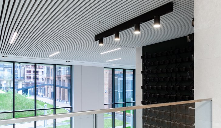Простые и строгие решения прекрасно сочетаются с минималистичным интерьером холлов. Линейные светильники, созданные с использованием алюминиевых профилей, вмонтированы в реечный потолок. Другая их часть выполнена в чёрном цвете в качестве подвесных светильников, контрастируя со светлым интерьером.