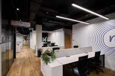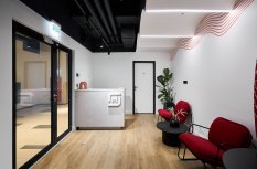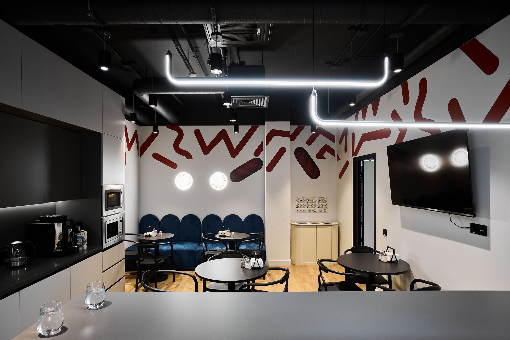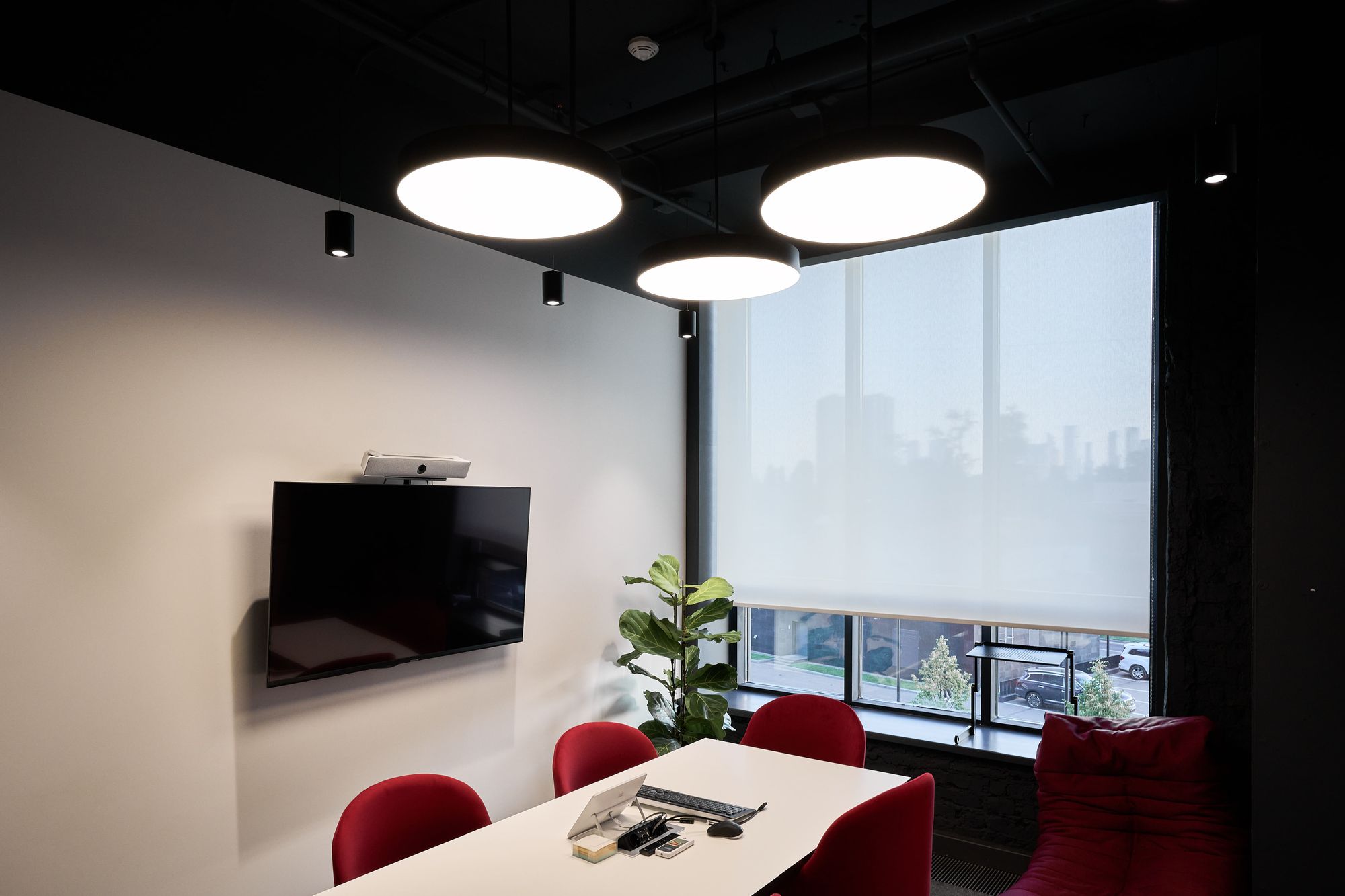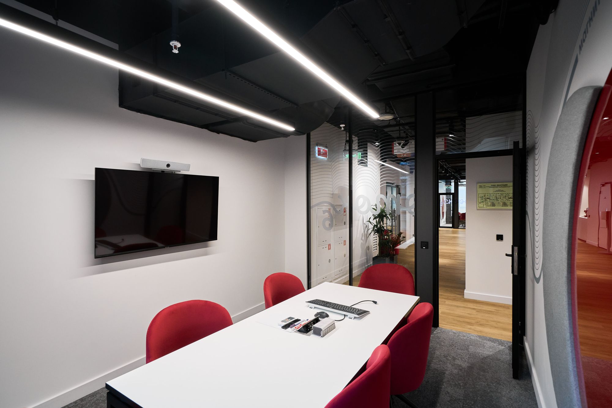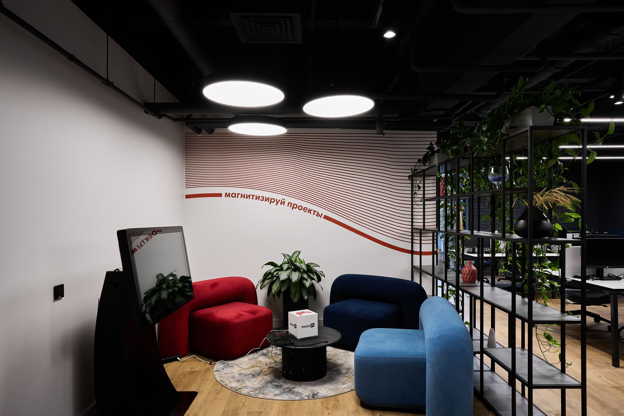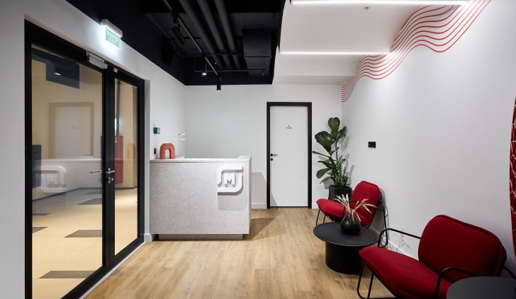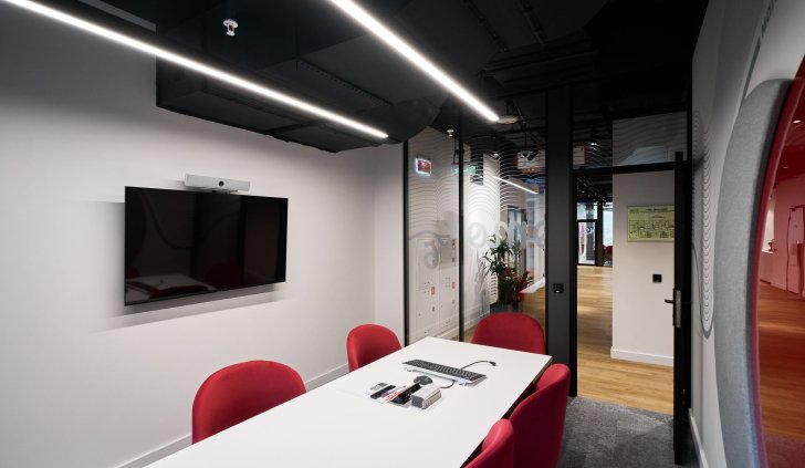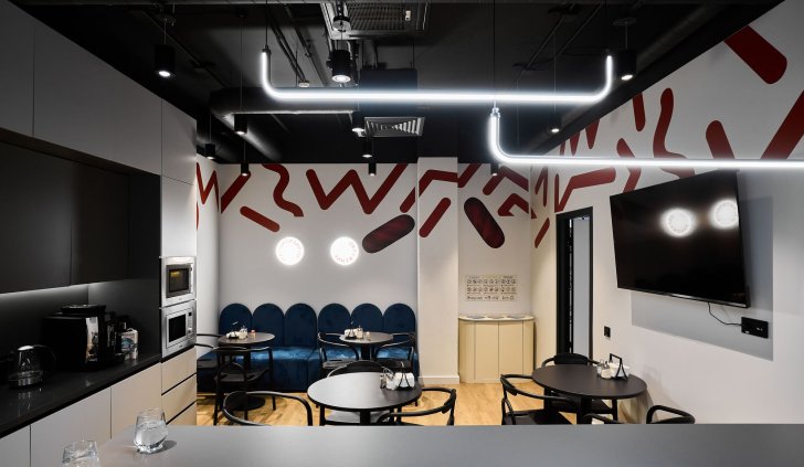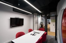 Интерьер офиса создает ощущение камерности благодаря белым стенам и преимущественно черному потолку. Однако красные и серые элементы оживляют интерьер, вдохновляя работников на творческую деятельность.