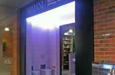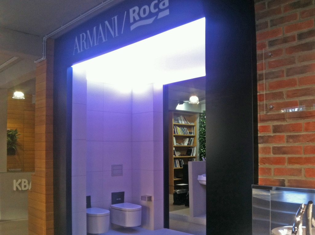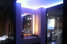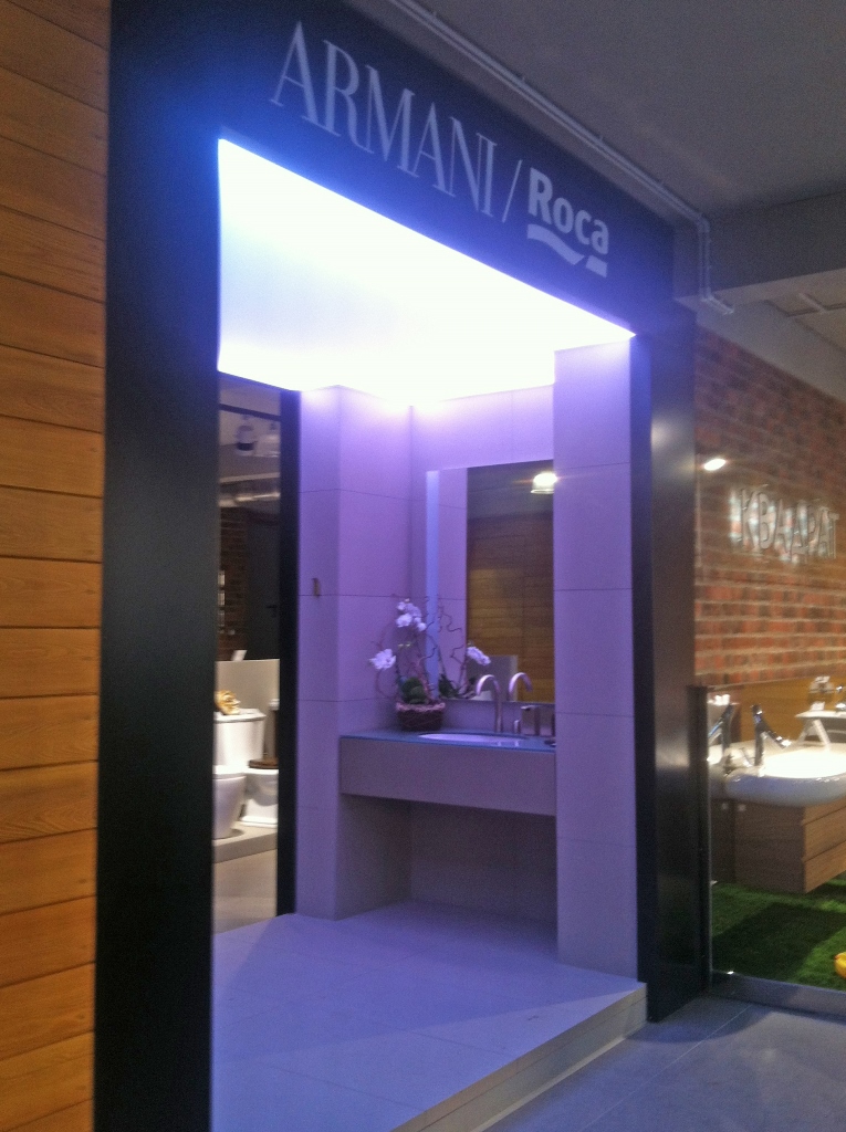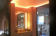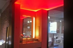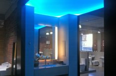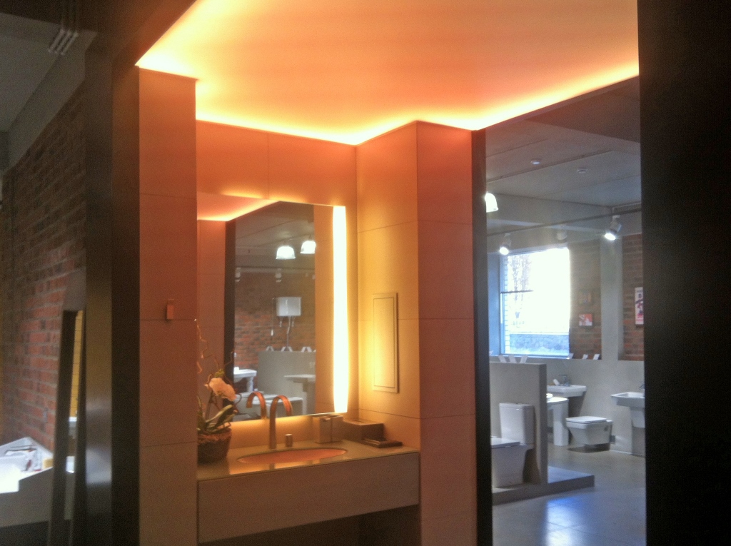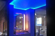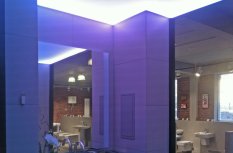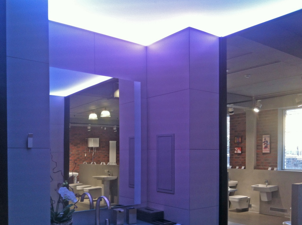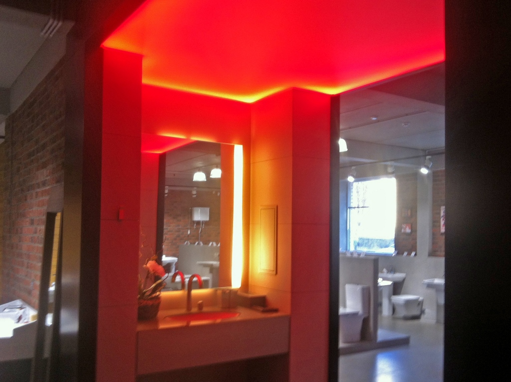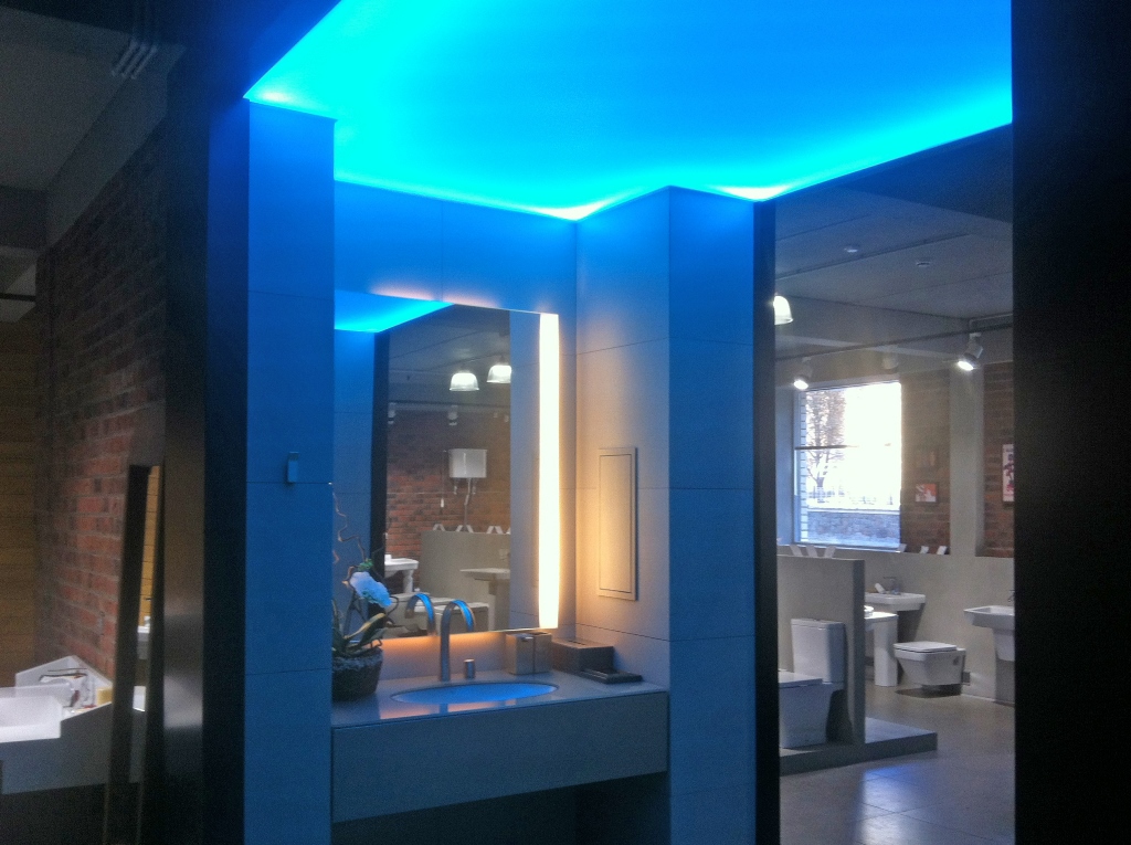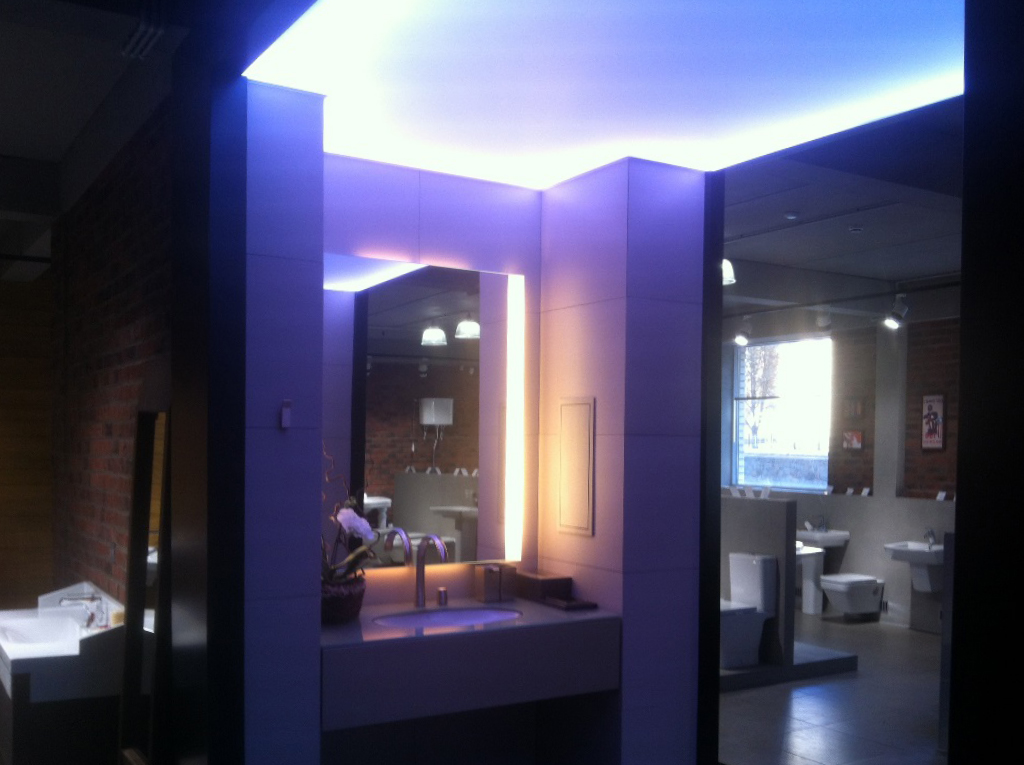 Для светового оформления демонстрационного зала сантехники было решено использовать потолок из рассеивающего светопропускающего материала, за которым установили 2 вида светодиодных лент. Установленные по периметру многоцветная и белая ленты отличаются по своей яркости. В итоге заметно отличается создаваемый эффект.