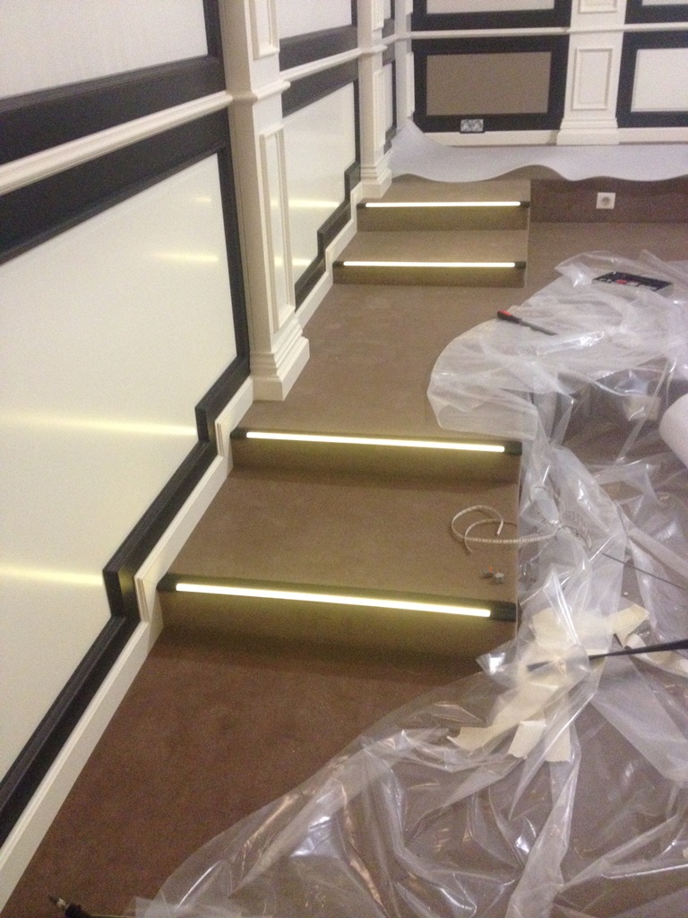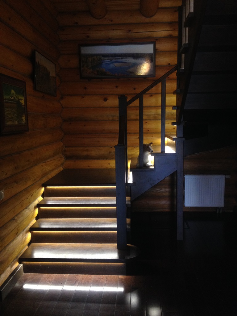 Естественно, вариантов установки подсветки существует огромное множество, но наиболее часто встречающимся является размещение светодиодной ленты в специальном алюминиевом профиле для ленты. Сама по себе светодиодная лентарасполагается под ступенями. Стоит заметить, что для дополнительной экономии на электричестве, можно установить датчики, отвечающие за управление освещением.