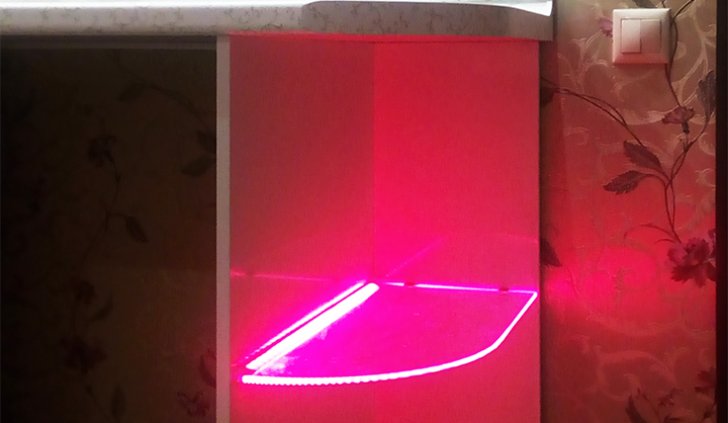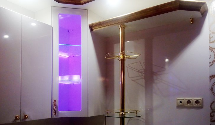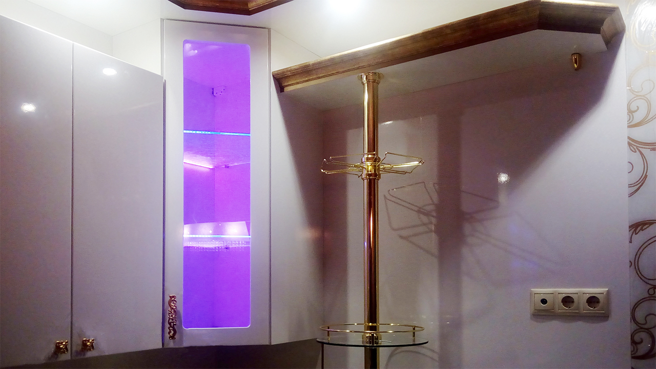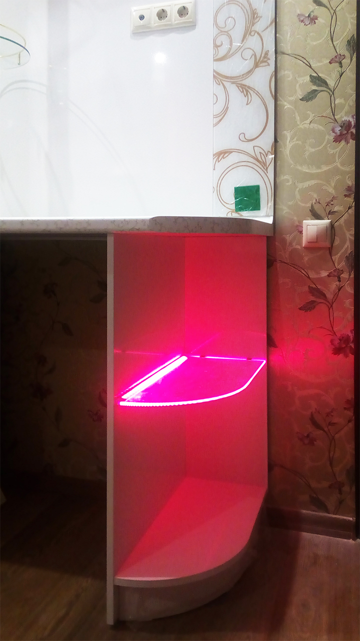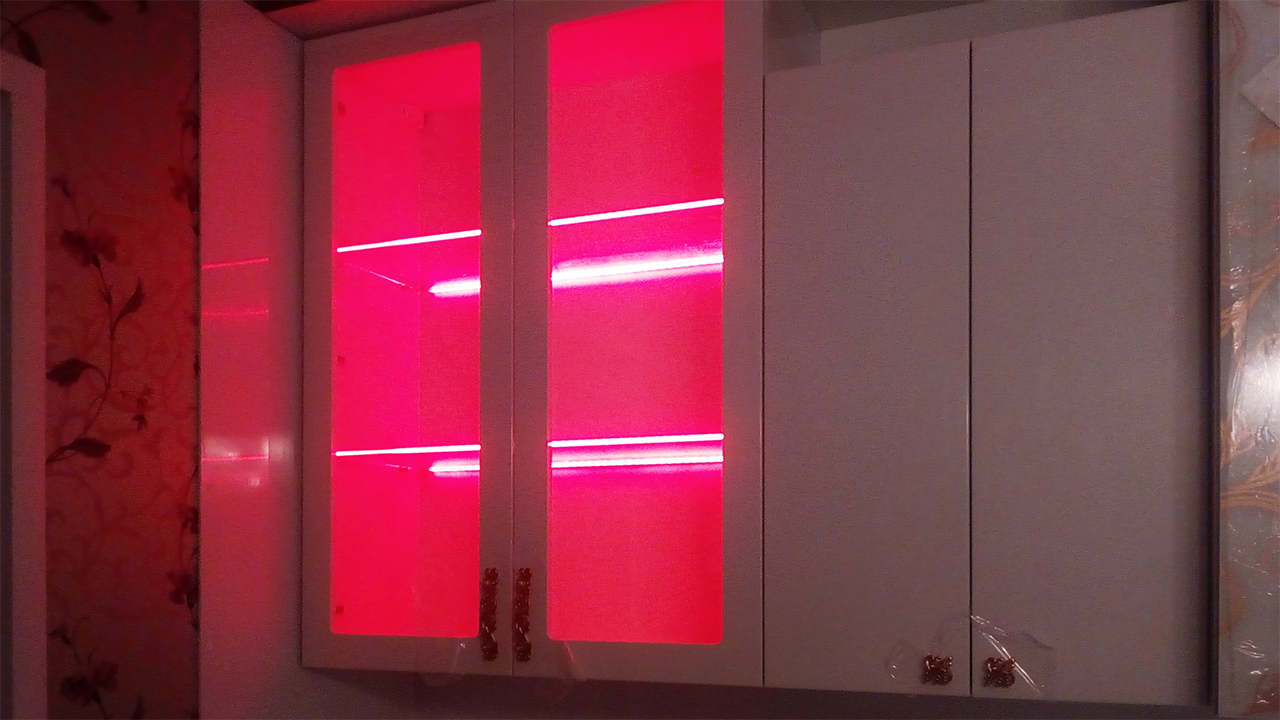 Для исполнения подобных решений применяется специальный алюминиевый профиль, который монтируется между кромкой полки и тыльной стороной шкафа, делая незаметной систему и оставляя только эстетику многоцветного освещения.