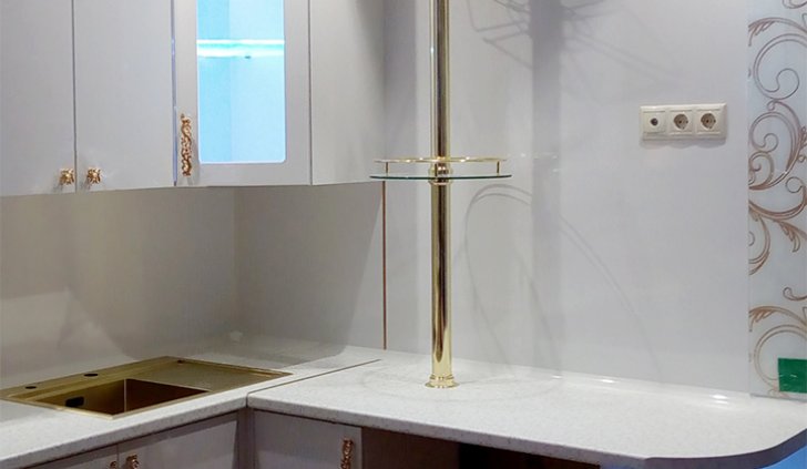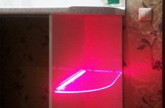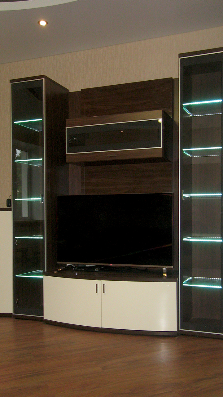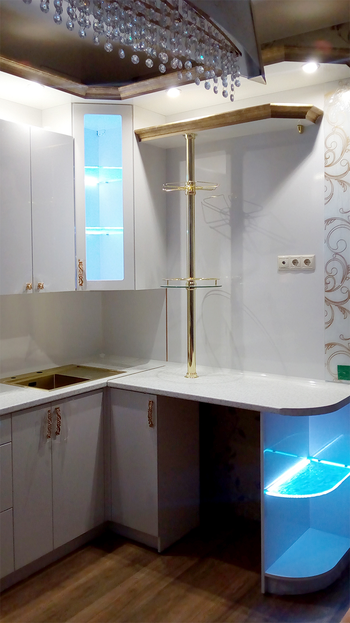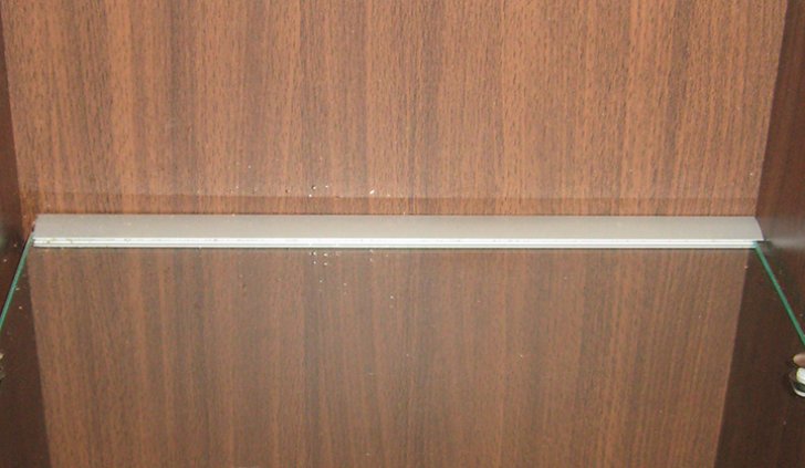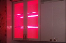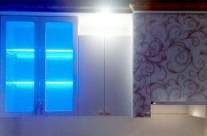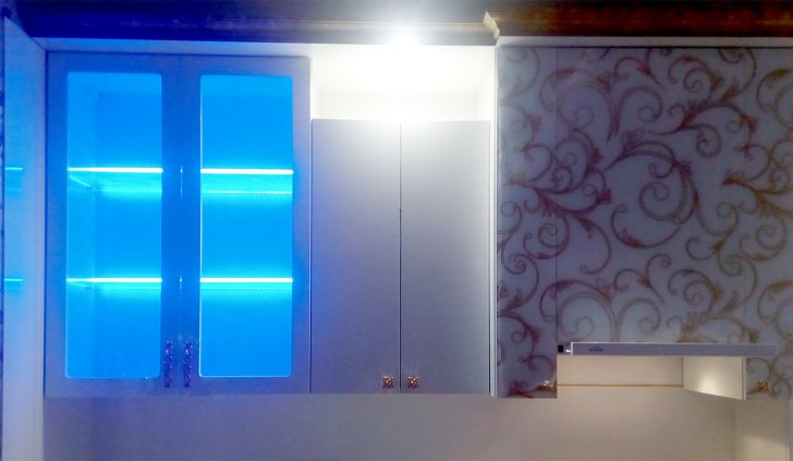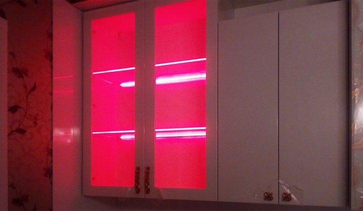 Для исполнения подобных решений применяется специальный алюминиевый профиль, который монтируется между кромкой полки и тыльной стороной шкафа, делая незаметной систему и оставляя только эстетику многоцветного освещения.