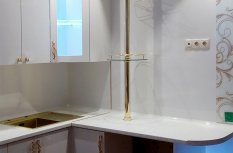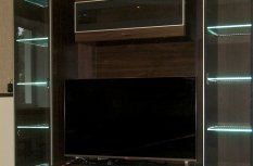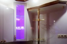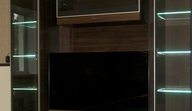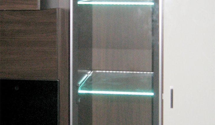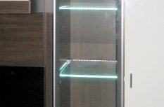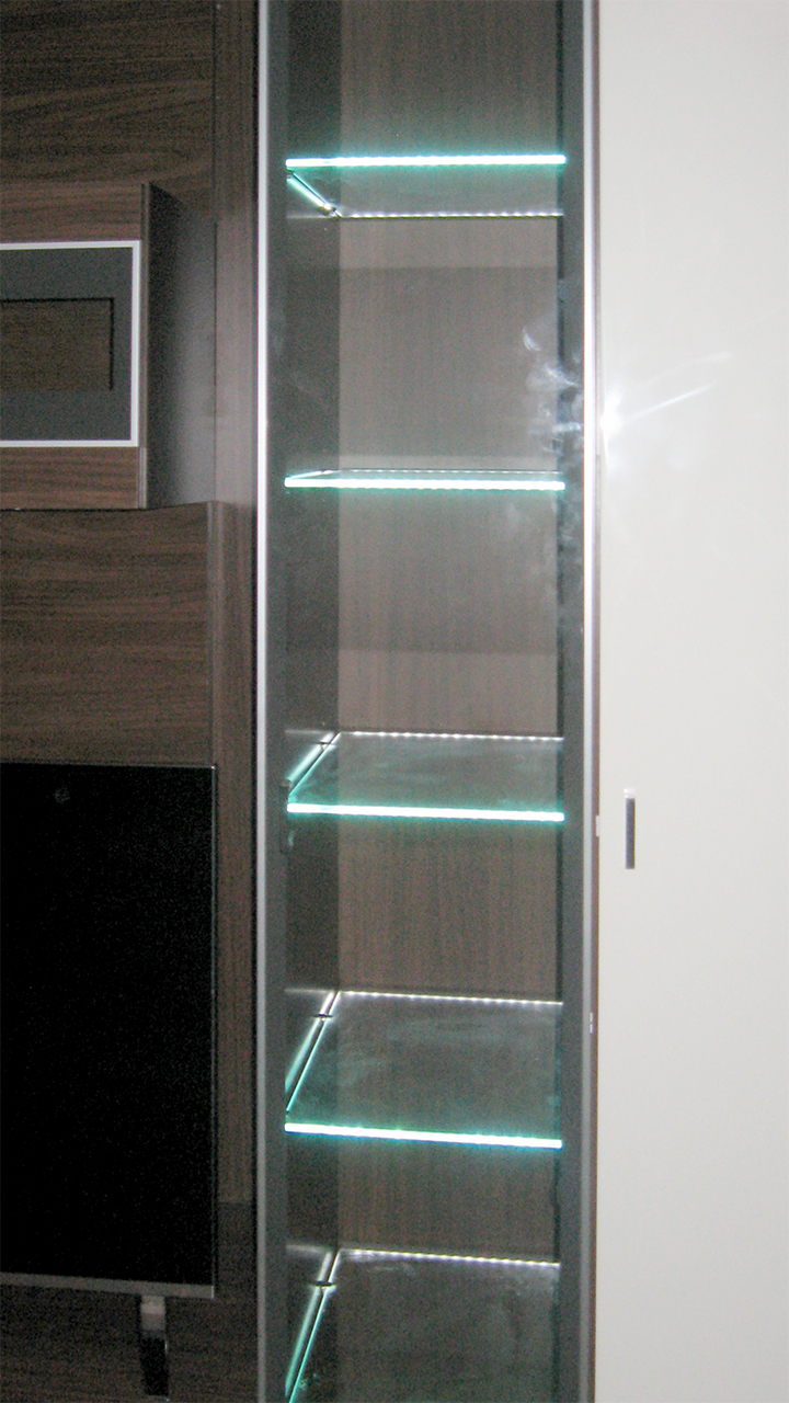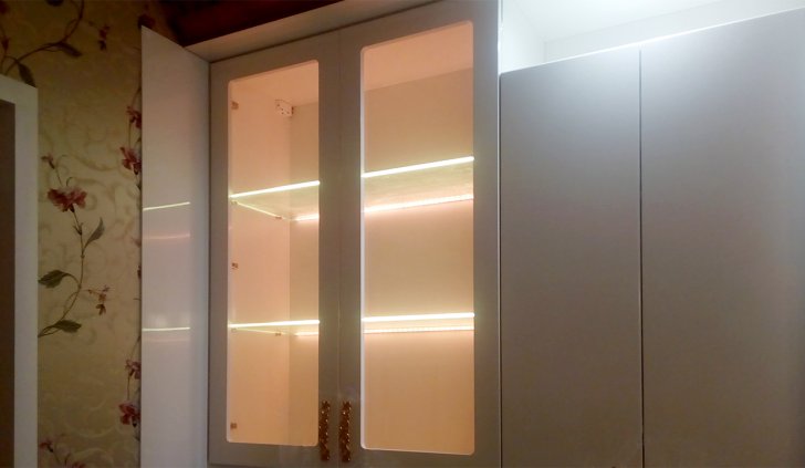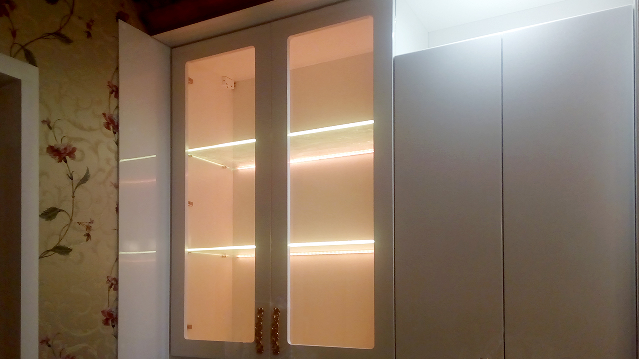 Владельцы представленной квартиры захотели организовать светодиодную подсветку стеклянных полок, расположенных на кухонной мебели и мебели в гостиной. В качестве источника света была выбрана RGB светодиодная лента Arlight. Её повышенная яркость позволила подсветить не только сами полочки, но также дать фоновое освещение внутренним поверхностям шкафов.