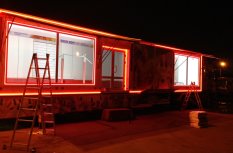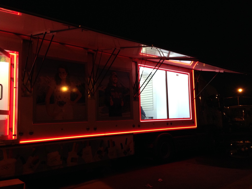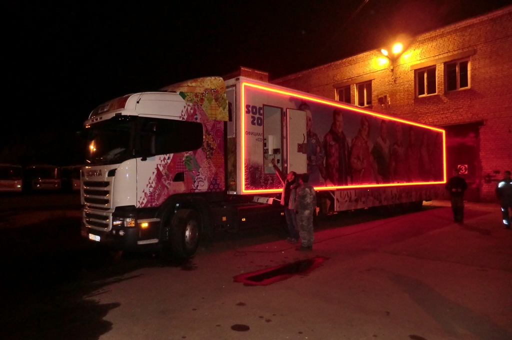 Для достижения поставленной цели, подсветка устанавливалась и на тягач, и на прицеп, в котором располагался магазин одежды с символикой Олимпийских игр и сопутствующие товары. Вмонтированная в специальный алюминиевый профиль светодиодная лента, закреплялась снаружи прицепа, матовый экран матового цвета создавал эффект единой линии света.