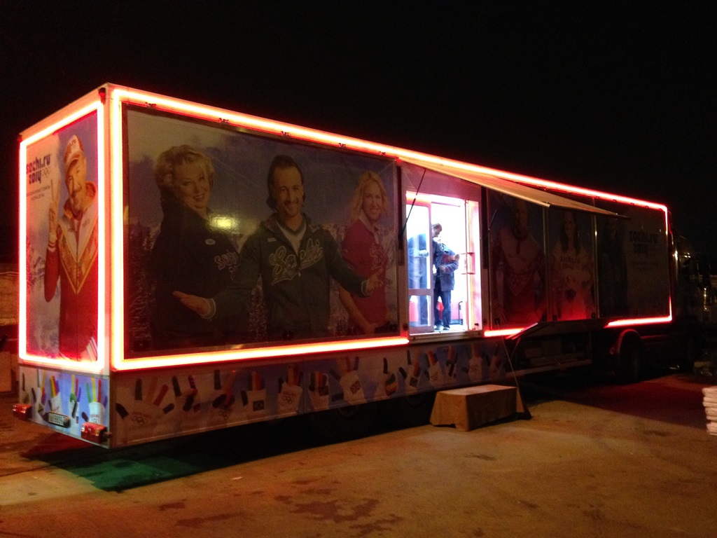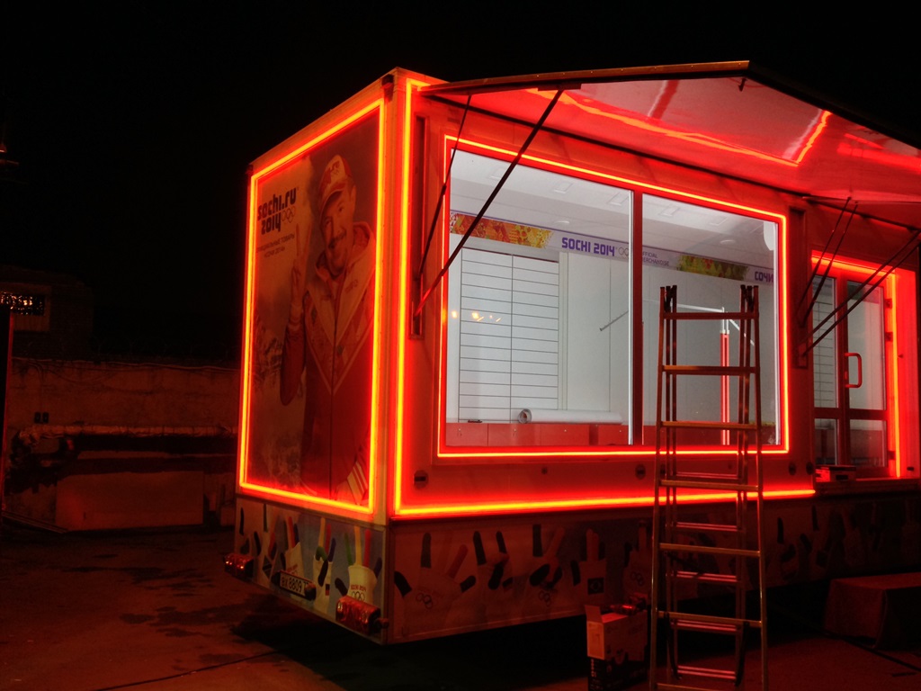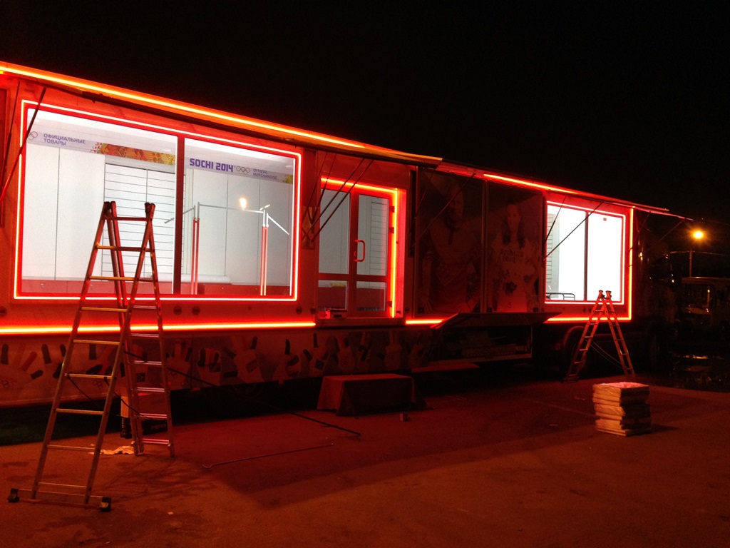 Подсветка фургонов по продаже товаров с символикой Олимпийских игр, прошедших в Сочи в 2014 году, осуществлялась при помощи светодиодной ленты компании Arlight.