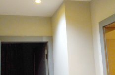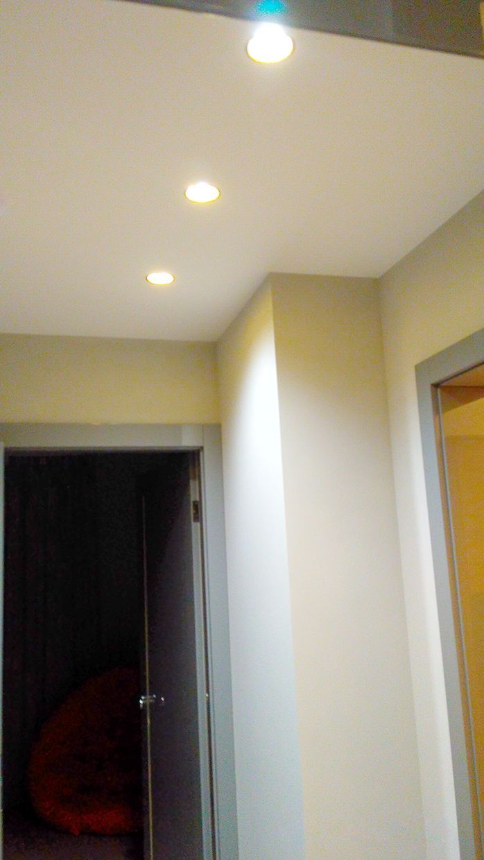В прихожей в качестве основного освещения применяются круглые встраиваемые светильники, обеспечивающие широкий угол свечения.
