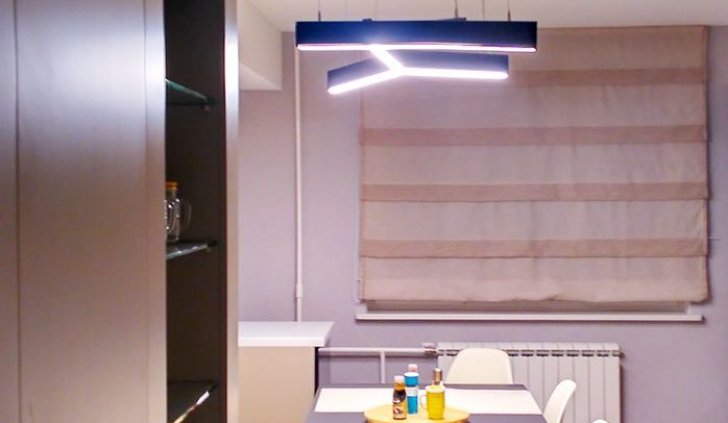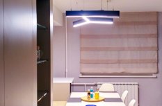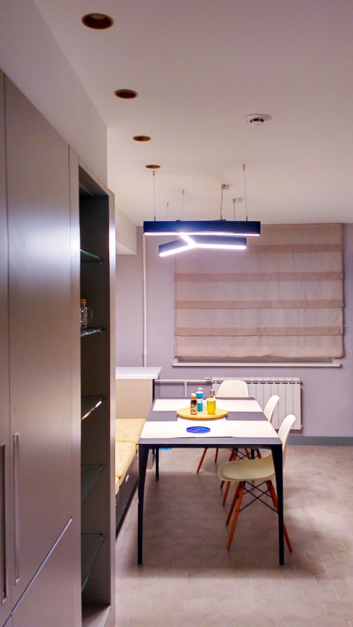 На кухне над столом разместился стильный современный подвесной светильник геометрической формы, выполненный из светодиодной ленты и алюминиевого профиля.