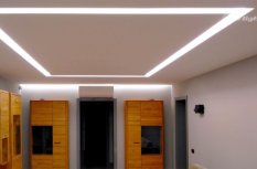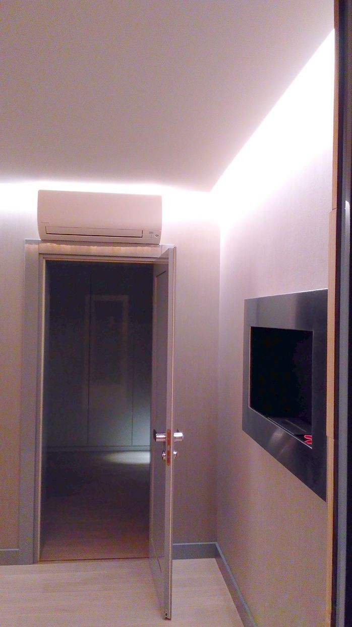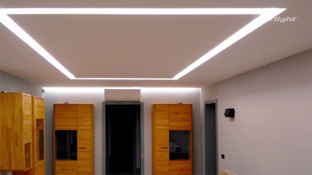 В проекте квартиры использовались разные типы освещения и оборудования Arlight. В жилых комнатах основное и декоративное освещение реализовано с помощью светодиодной ленты. Равномерное свечение встроенного экрана прямоугольной формы и закарнизная подсветка, создающая эффект парения.