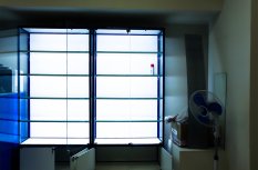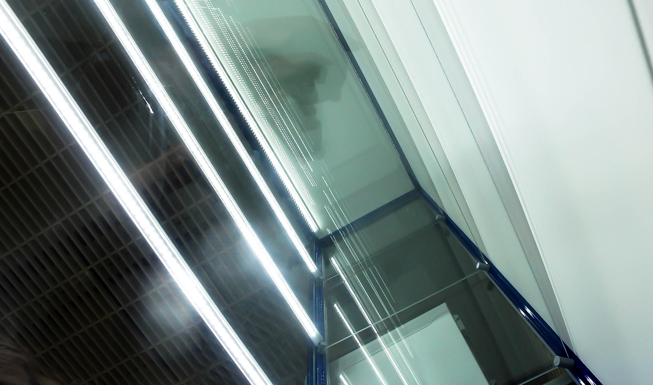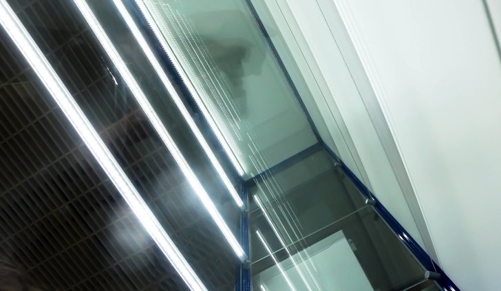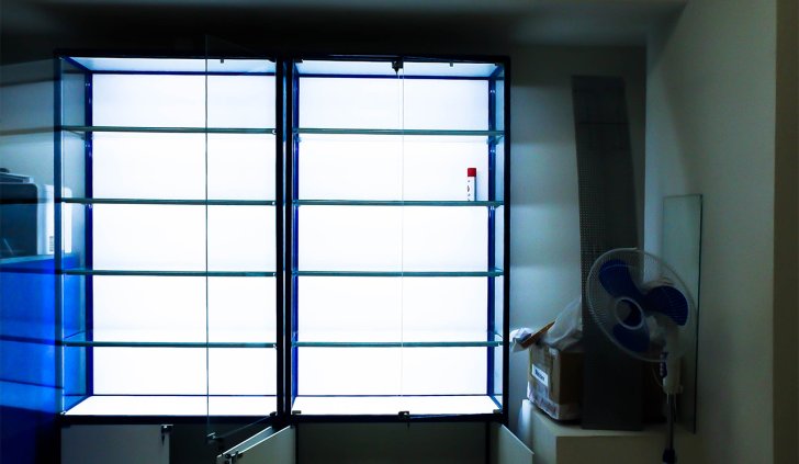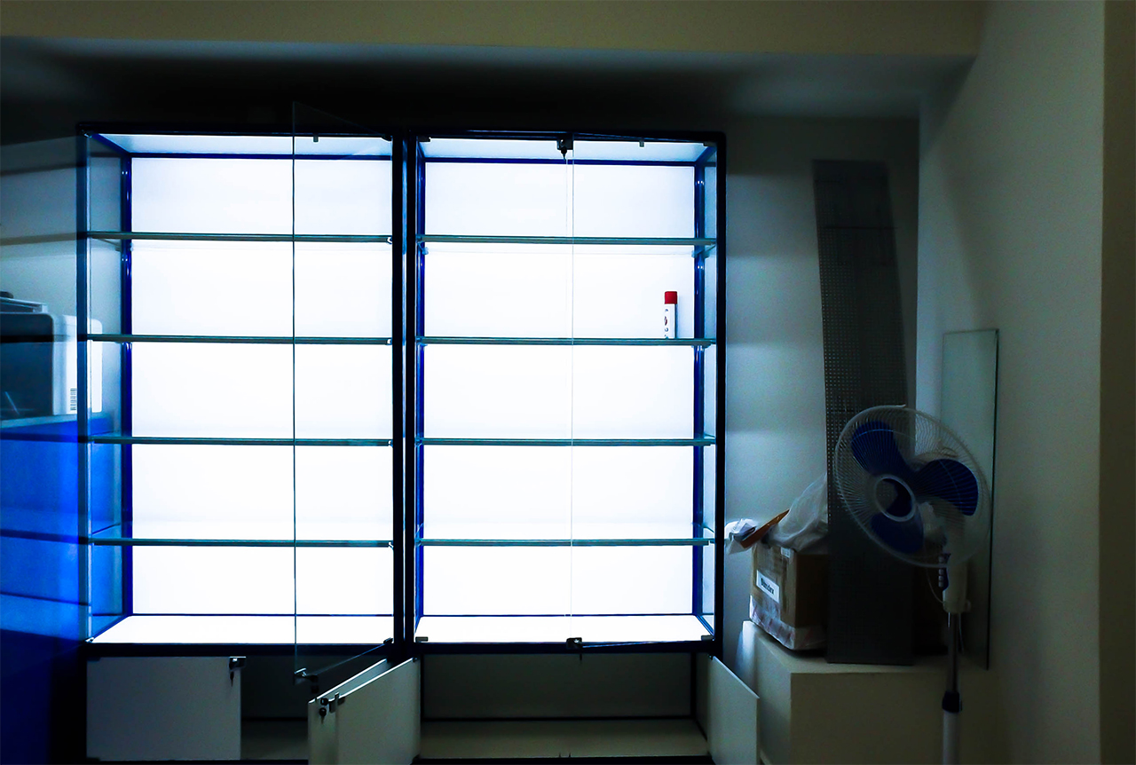 Установка подсветки выполнена на основе алюминиевого профиля, который закреплён в передней части витрин на уровне полок. А внутри него уже спрятана светодиодная лента и необходимые провода. Матовый экран рассеивает свет и делает подсветку равномернее. Такое решение позволяет реализовать задачу аккуратно и красиво, кроме того, установка ленты на алюминиевый профиль продлевает её срок службы, благодаря эффективному отведению тепла.
