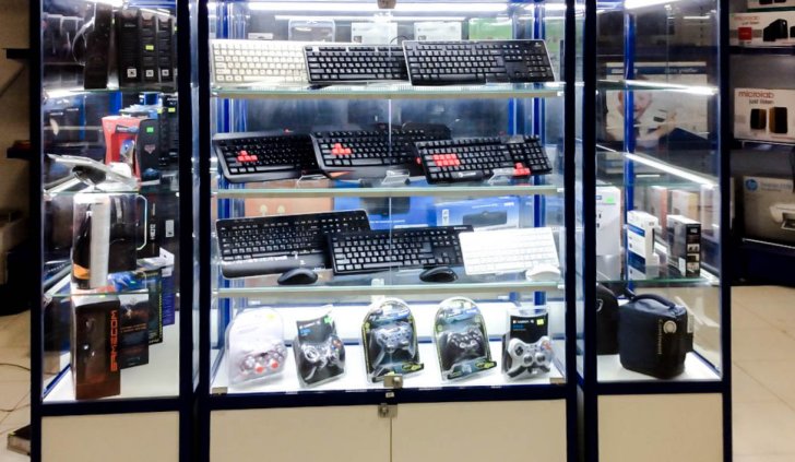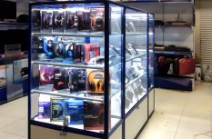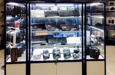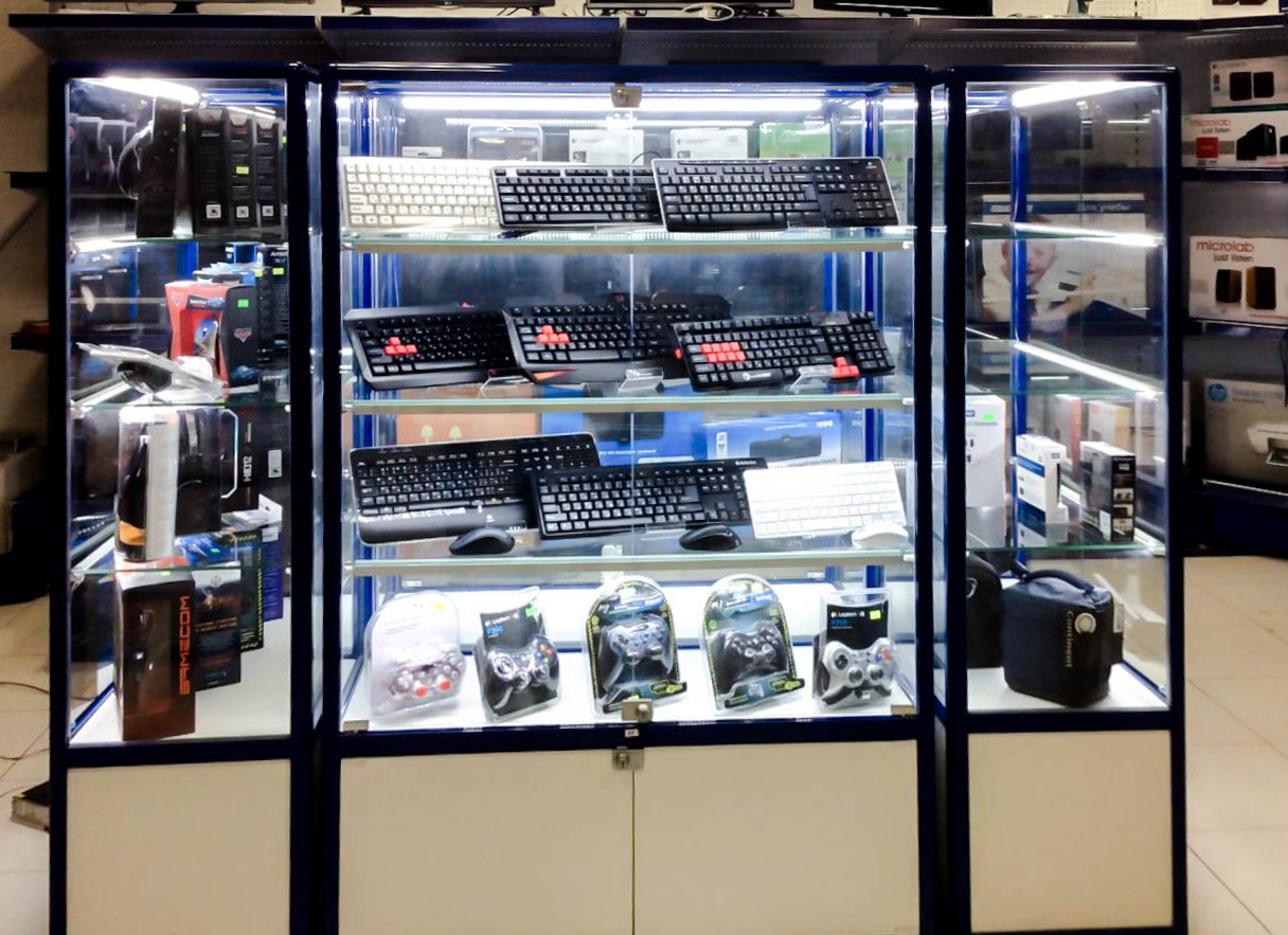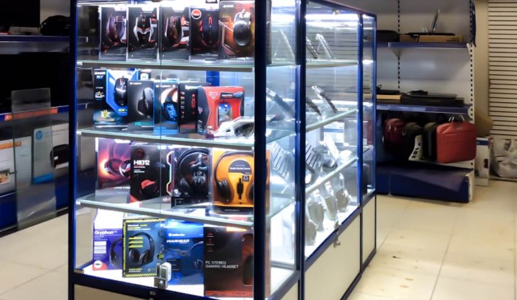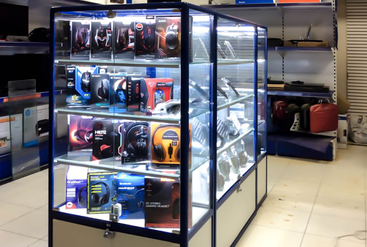 В данном случае выбор пал на светодиодную ленту холодного белого оттенка. Он довольно специфичен и подойдёт не для каждого вида товаров, но зато прекрасно вписывается в концепцию современных технологий и оборудования, а значит и для магазина компьютерной техники – хорошее решение.