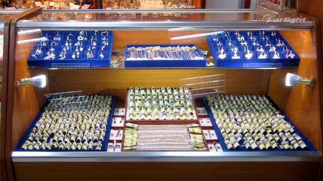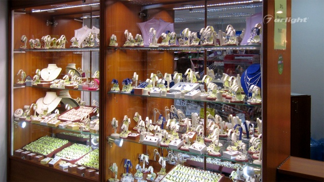 С помощью оборудования Arlight была выполнена светодиодная подсветка витрин в ювелирном магазине. Алюминиевый профиль, в который позже была помещена светодиодная лента, был закреплён на нескольких витринах разных размеров.