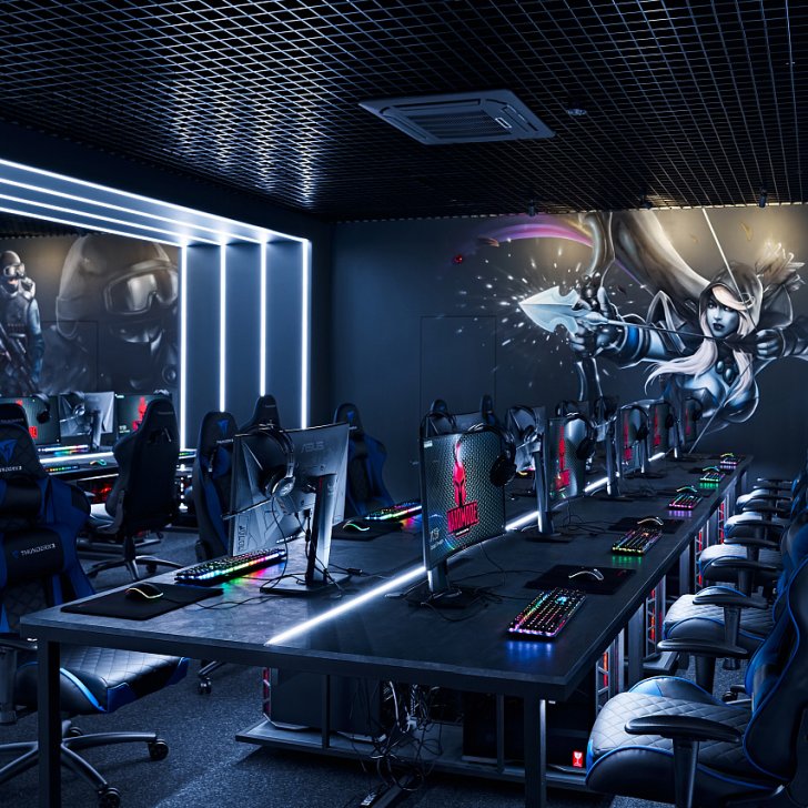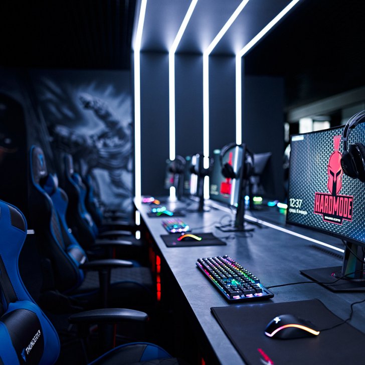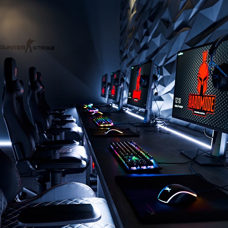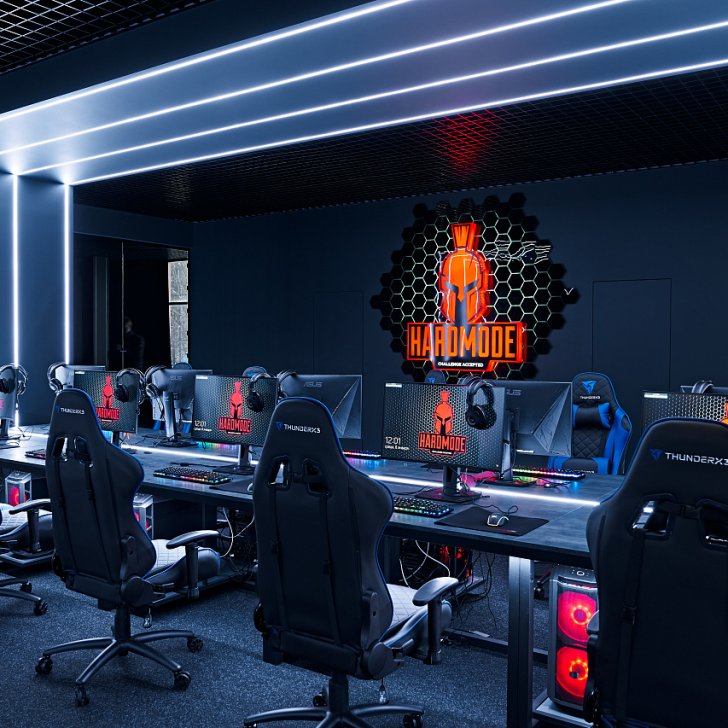 Киберарена Hardmode – это как раз тот случай, когда, казалось бы, декоративные решению выступают в роли основного освещения. В тёмном помещении, наполненном фантазийными образами, активные световые линии, интегрированные в стены и потолок, выступают в прямом смысле ярким акцентом интерьера. Созданные с их помощью порталы поддерживают стилистические направления виртуального мира компьютерных игр.
