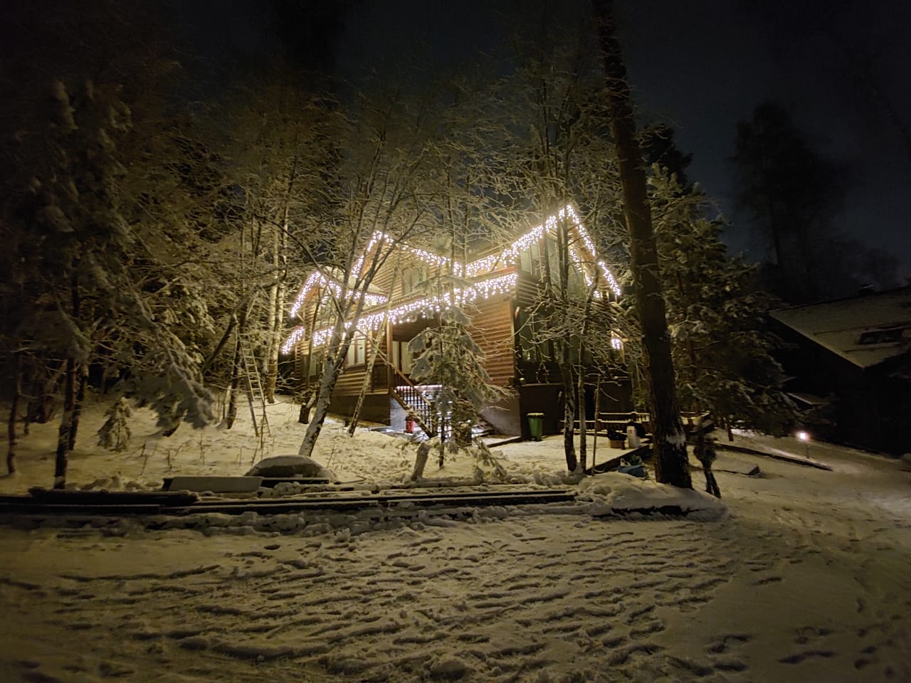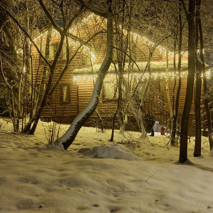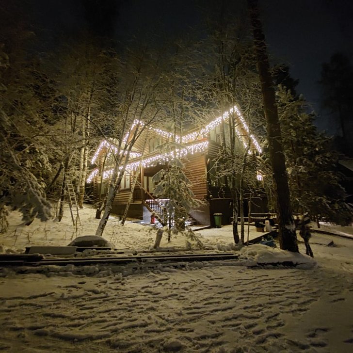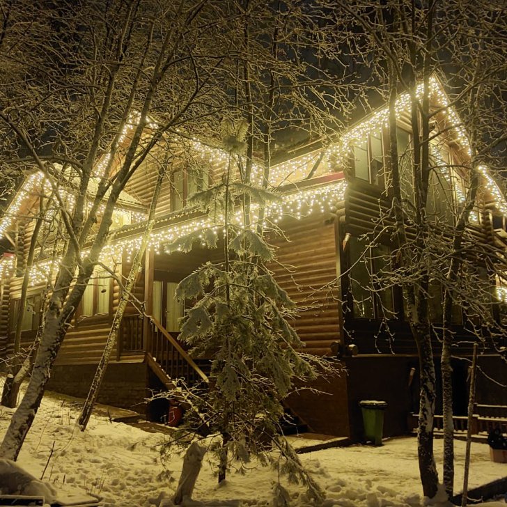 Теплый белый свет гирлянды добавляет облику дома ощущение теплоты, уюта и сказочной атмосферы. Все вместе это создает впечатляющий и привлекательный облик здания и придает ему особый шарм, особенно в темное время суток.