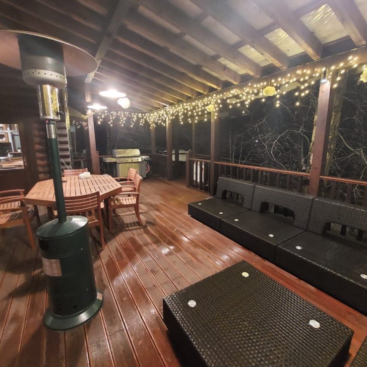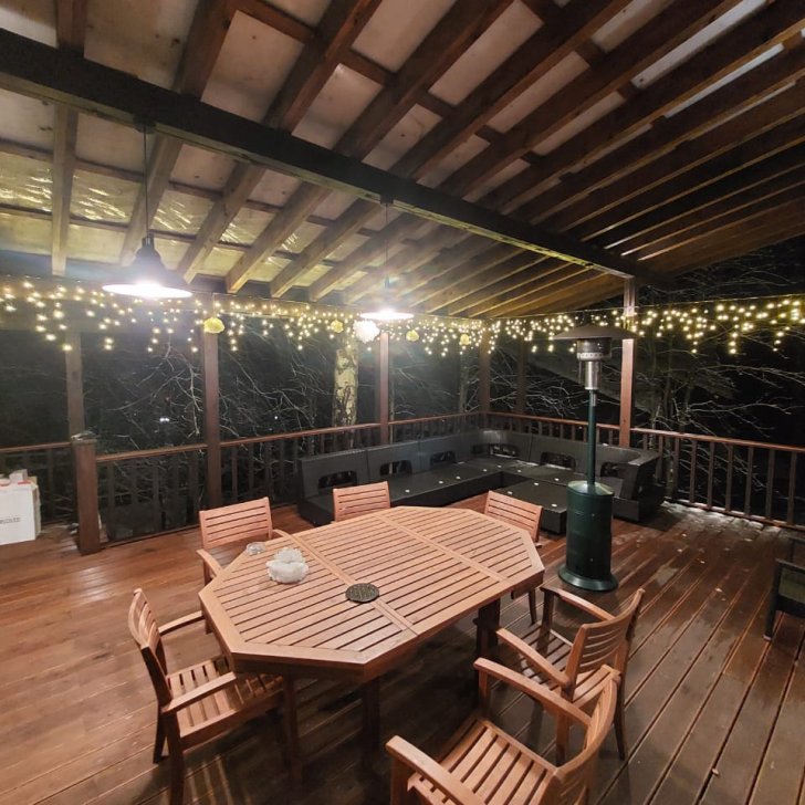 В данном проекте для подсветки контуров крыши по всему периметру дома была использована универсальная светодиодная гирлянда "бахрома" с черным цветом провода и молочно-белыми колпачками.