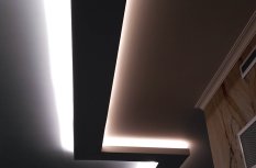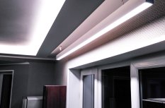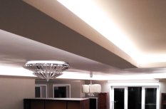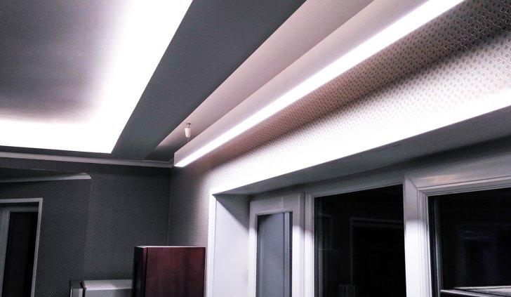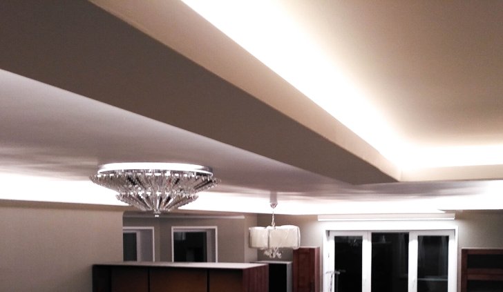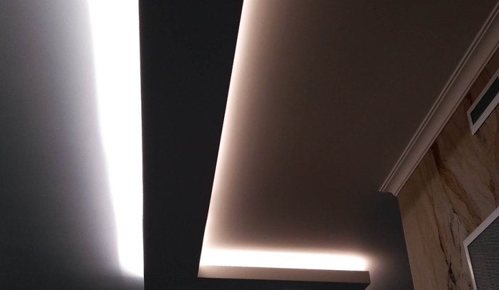 Лента приклеена в нишах таким образом, что световой поток направлен в центр комнаты, а не вверх. Такой вариант даёт больше освещения, но при этом есть риск сделать видимыми все неровности потолка. Поэтому использовать такое решение рекомендуется, только если вы уверены в его безупречности.